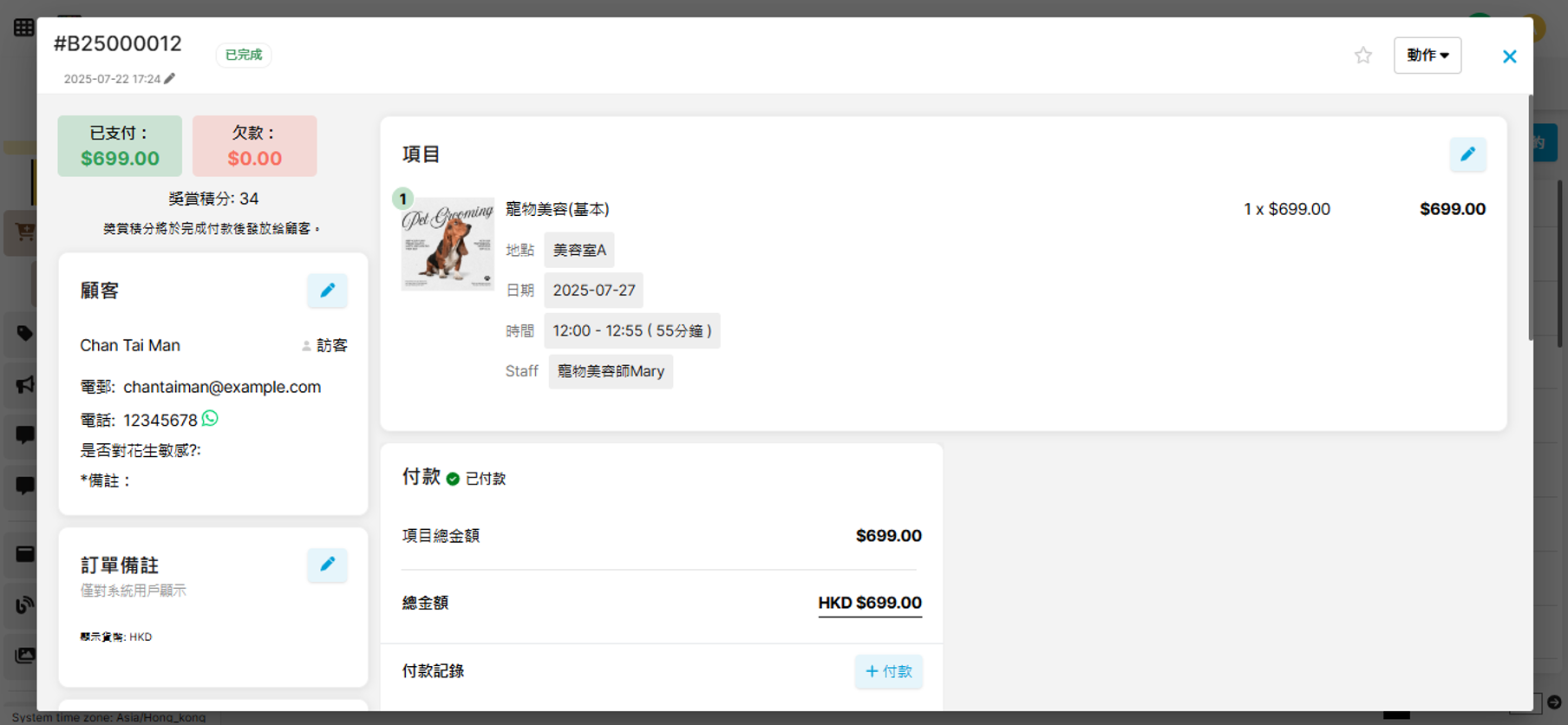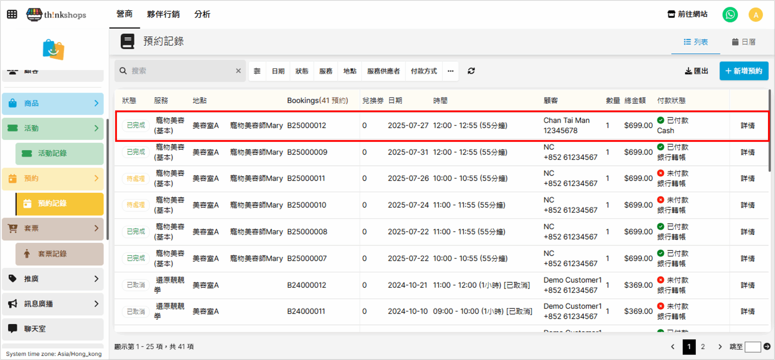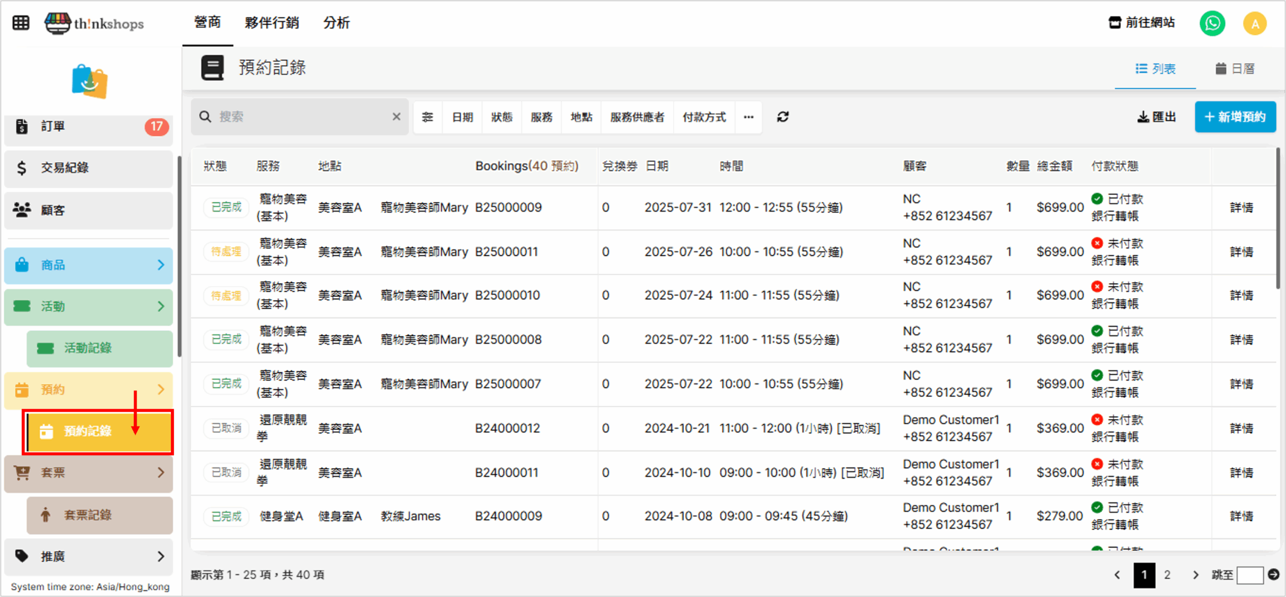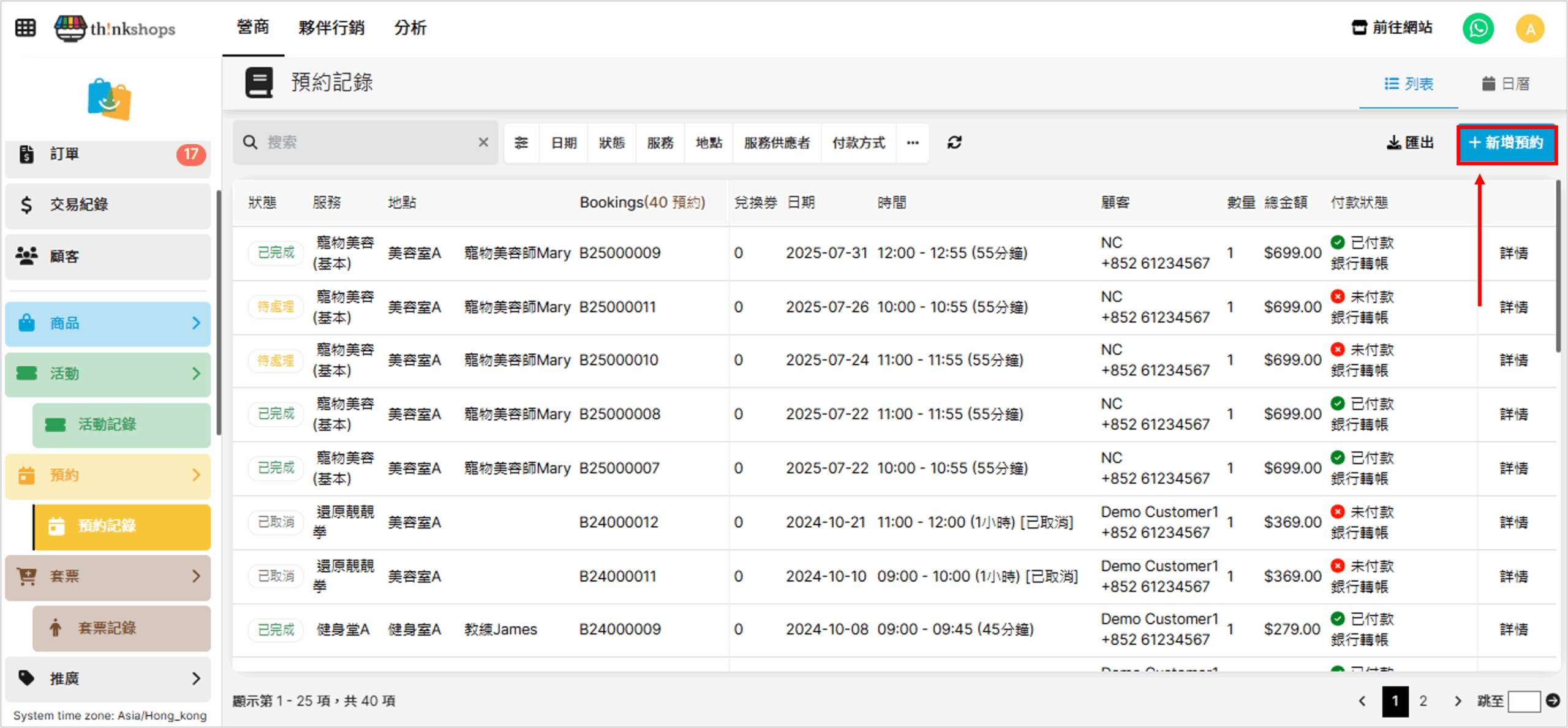 在「預約紀錄」您可以快速查看所有預約活動的銷售情況,並人手新增預約。