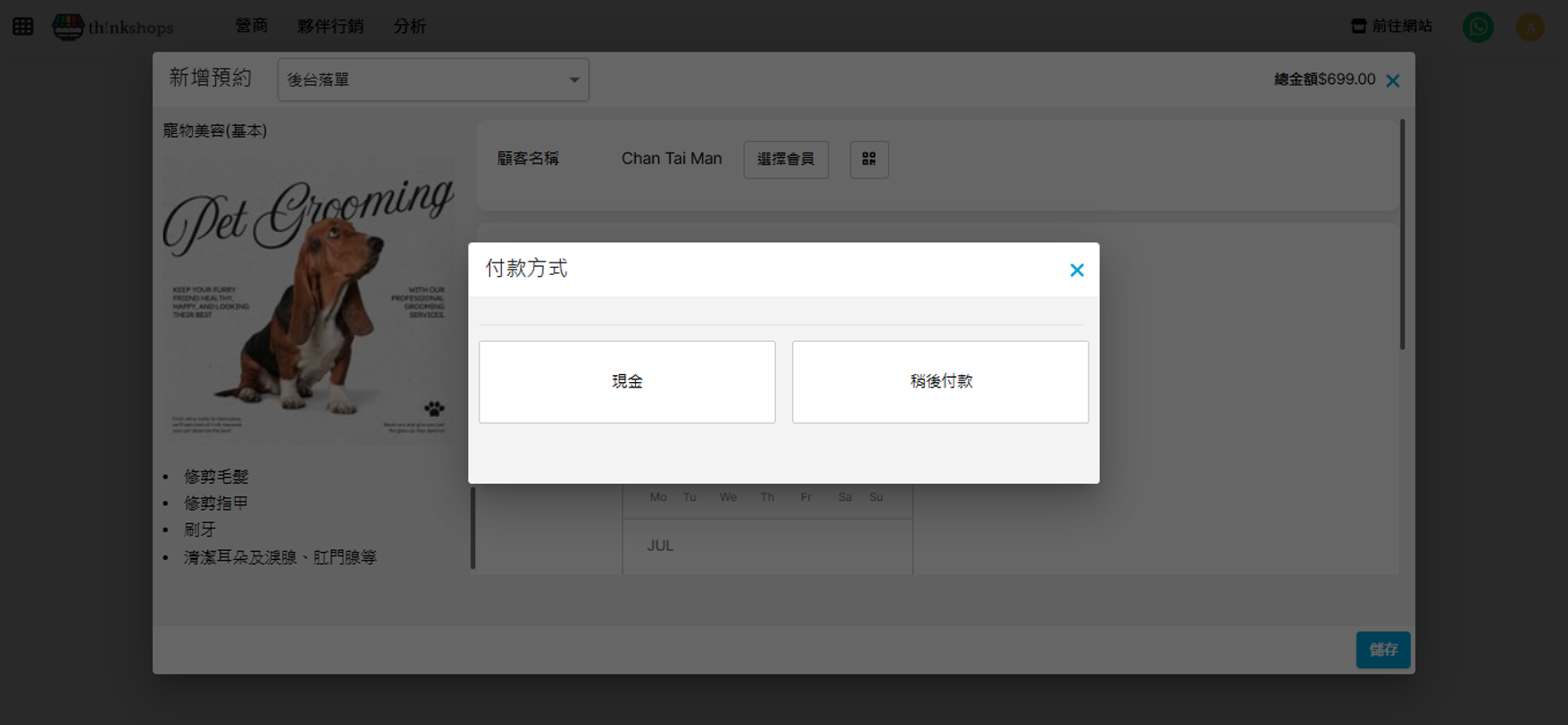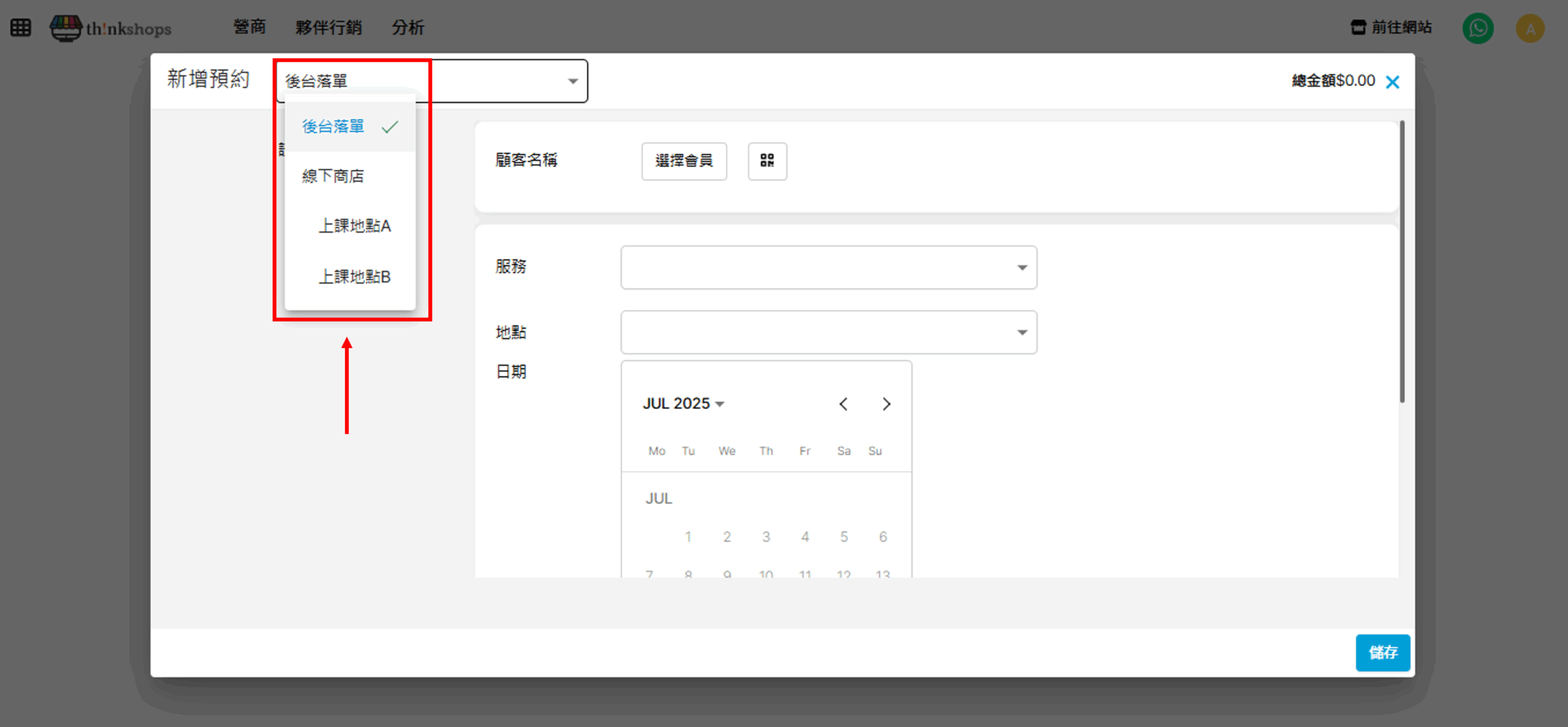 先選擇預約屬於線上下單(例如透過Whatsapp預約)或是線下下單(例如顧客於上課地點直接付款預約):