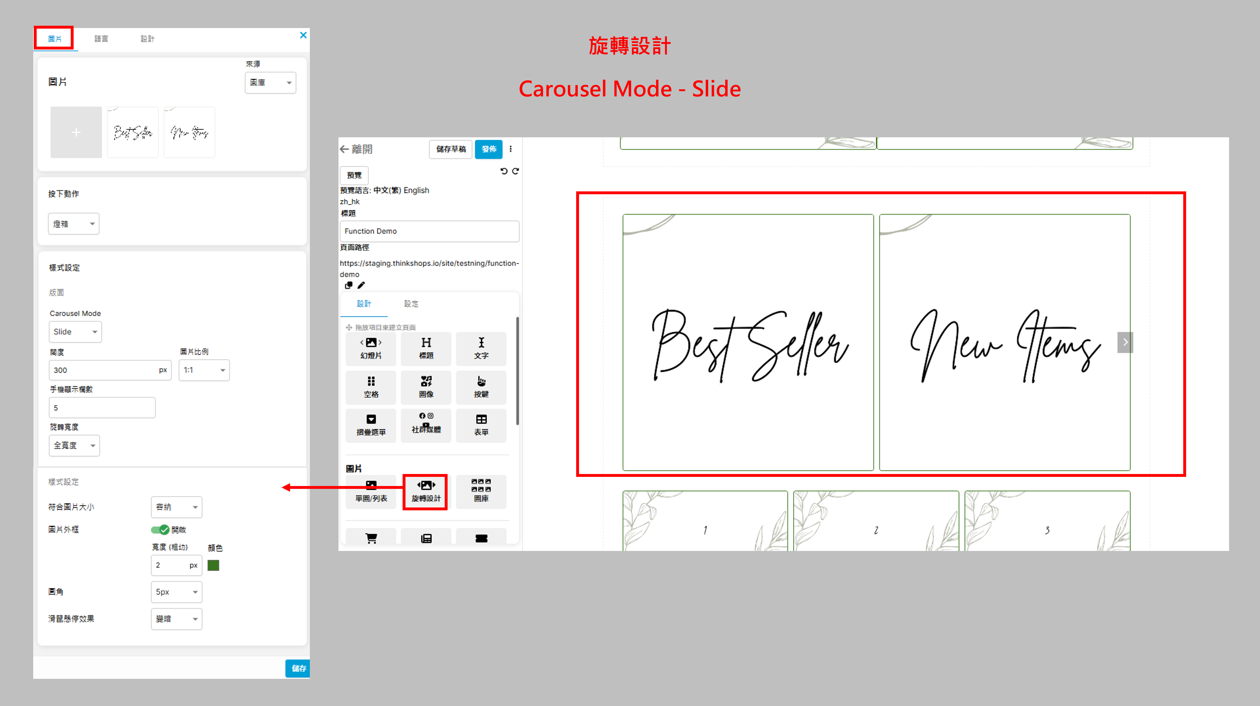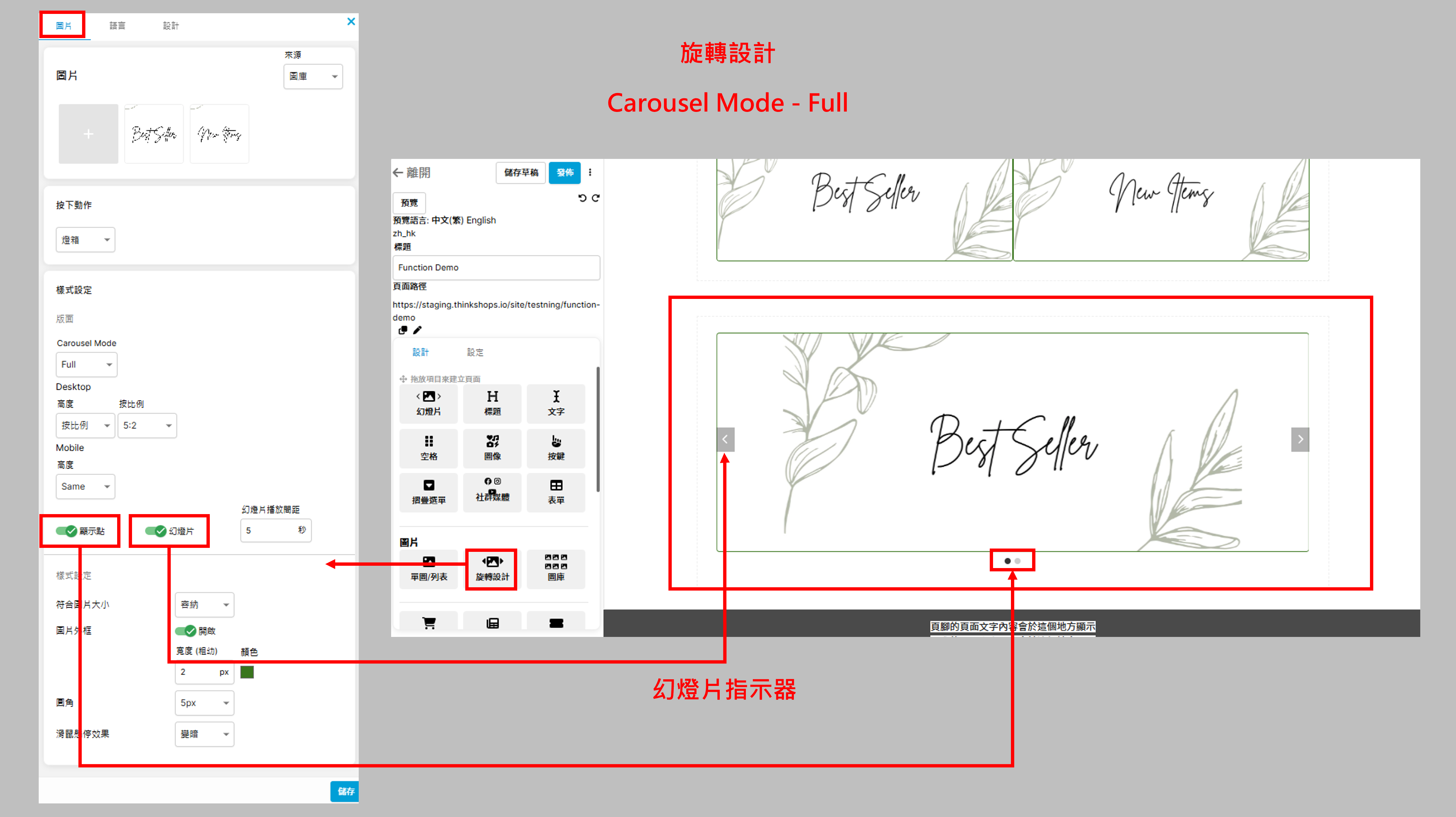 需設定圖片於電腦及手機的高度及比例、是否顯示點、幻燈片指示器及幻燈片播放間距