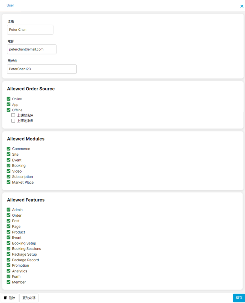 系統設定用戶設定系統設定 用戶設定 選單位置: 在後台頁面左側底部點撃「設定」,下拉選單至「系統設定」並點擊「用戶」。 商戶可按「新增」加入新職員及管理員帳戶,並於新增員工後,進入該員工最右方之「編輯」按鈕可勾選正方格揀選權限。 (以上例圖會因應商戶訂閱方案之不同而有差異,只供參考) 如需刪除員工,只需按左下方之「刪除」鍵並確認。