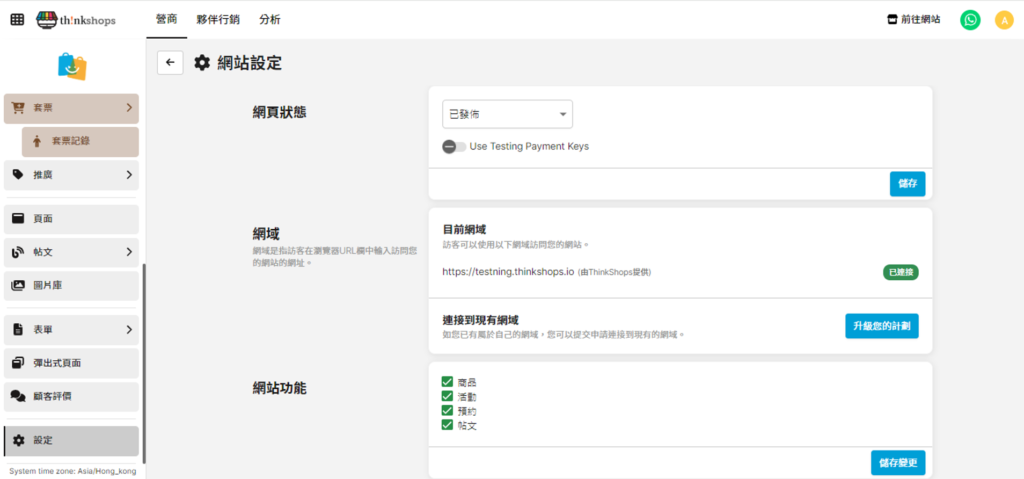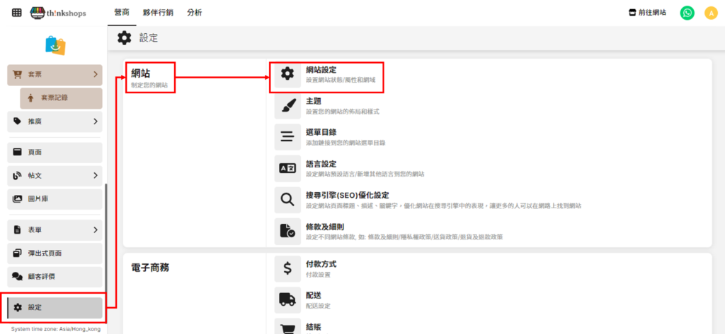 選單位置: 在後台頁面左側底部點撃「設定」,於「網站」分欄點擊「網站設定」。