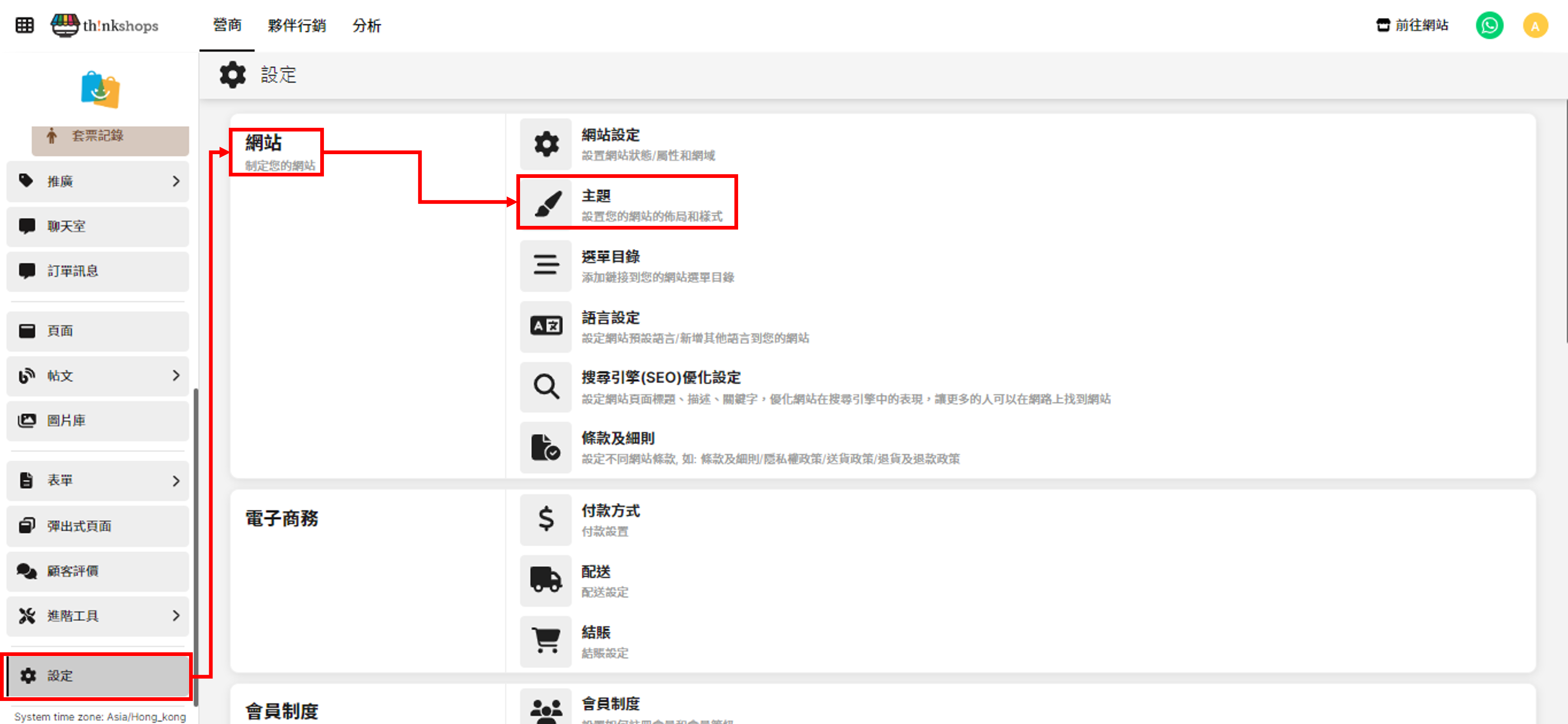 選單位置: 在後台頁面左側底部點撃「設定」,於「網站」一欄點擊「主題」。