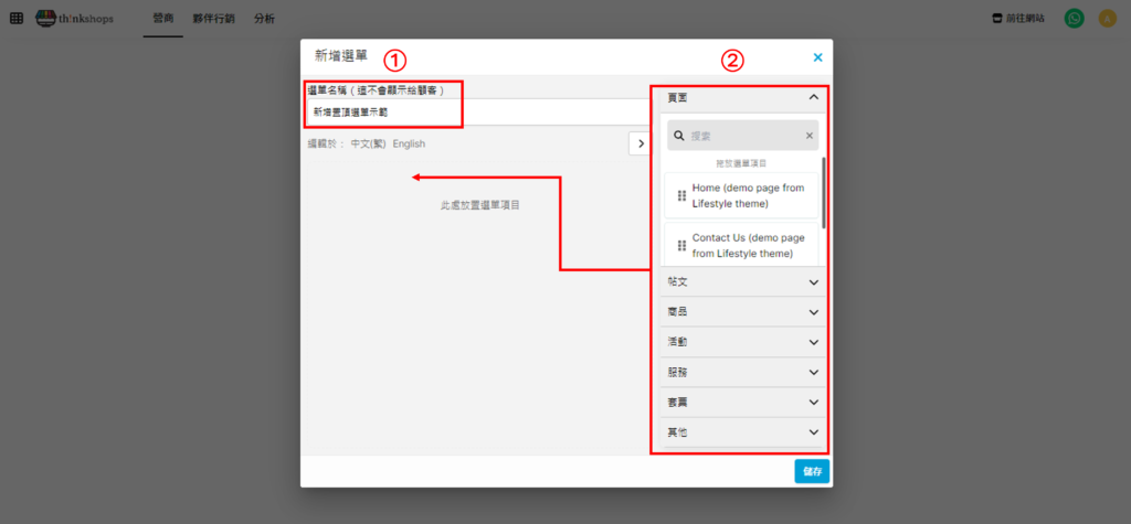 第三步 ①輸入「選單名稱」(顧客不會看到此名稱,只供做設定用)。②將您希望放於選單的頁面拖至左方位置