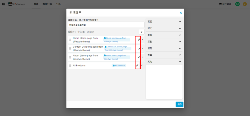 第四步 按筆形圖案,編輯各頁面顯示於選單的名稱(按需要),亦可加上選單圖標(按需要),完成後按「儲存」