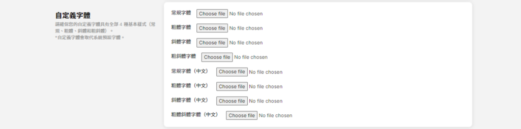 您可自設網站使用的中英文字體。請於此處上載字體檔案,並請確保您的自定義字體具有全部 4 種基本樣式(常規,粗體、斜體和粗斜體)。自定義字體會取代系統預設字體。