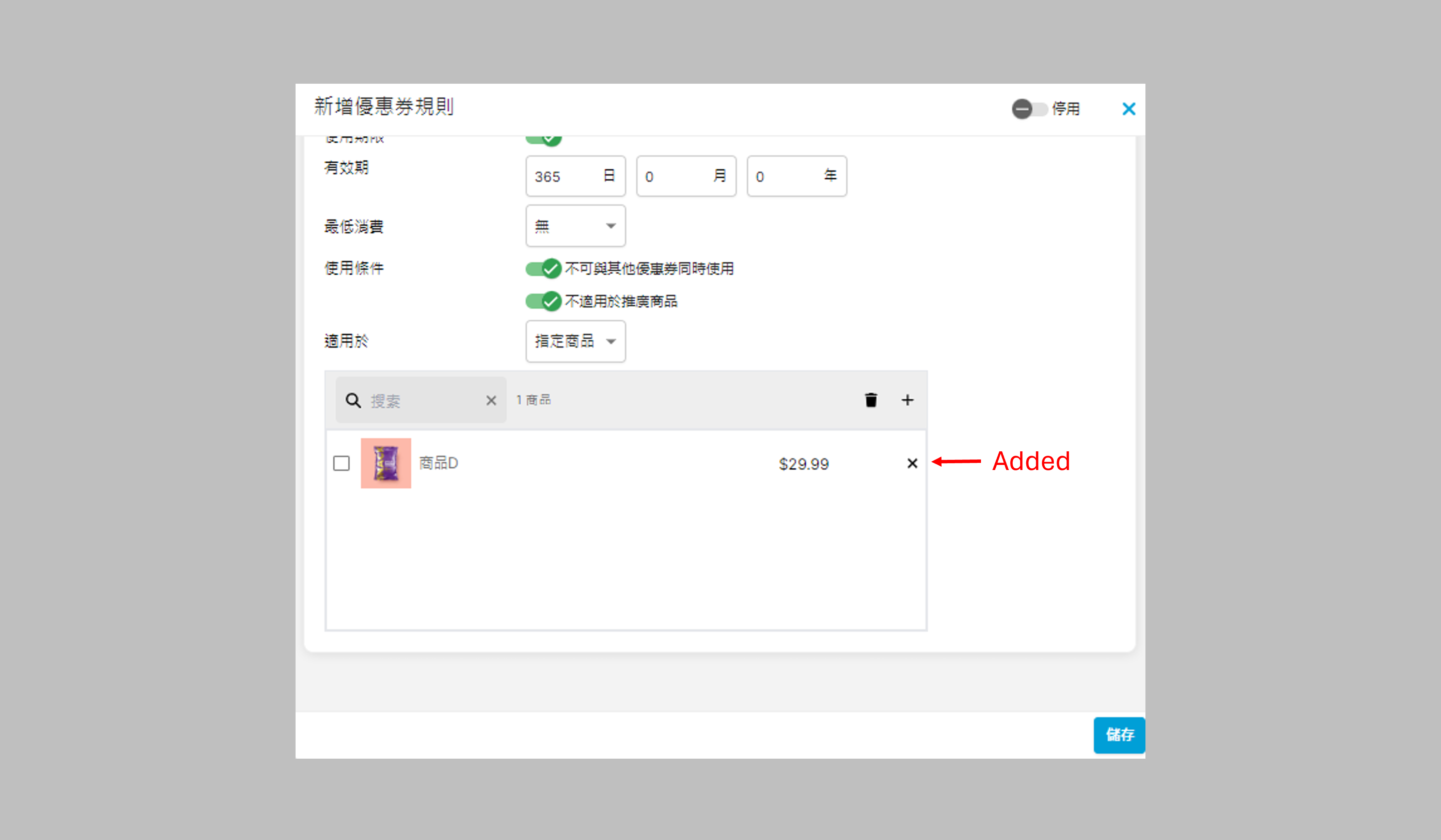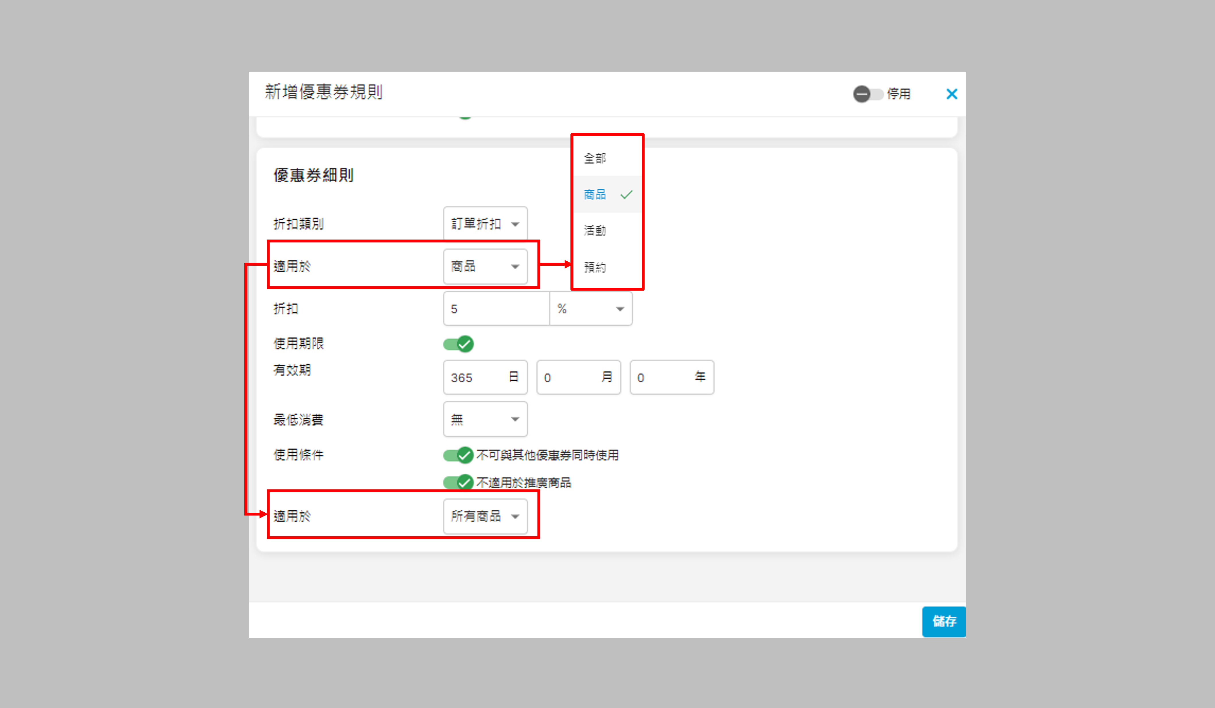 - 指定商品:優惠券只適用於已選商品(不受分類影響),步驟如下: