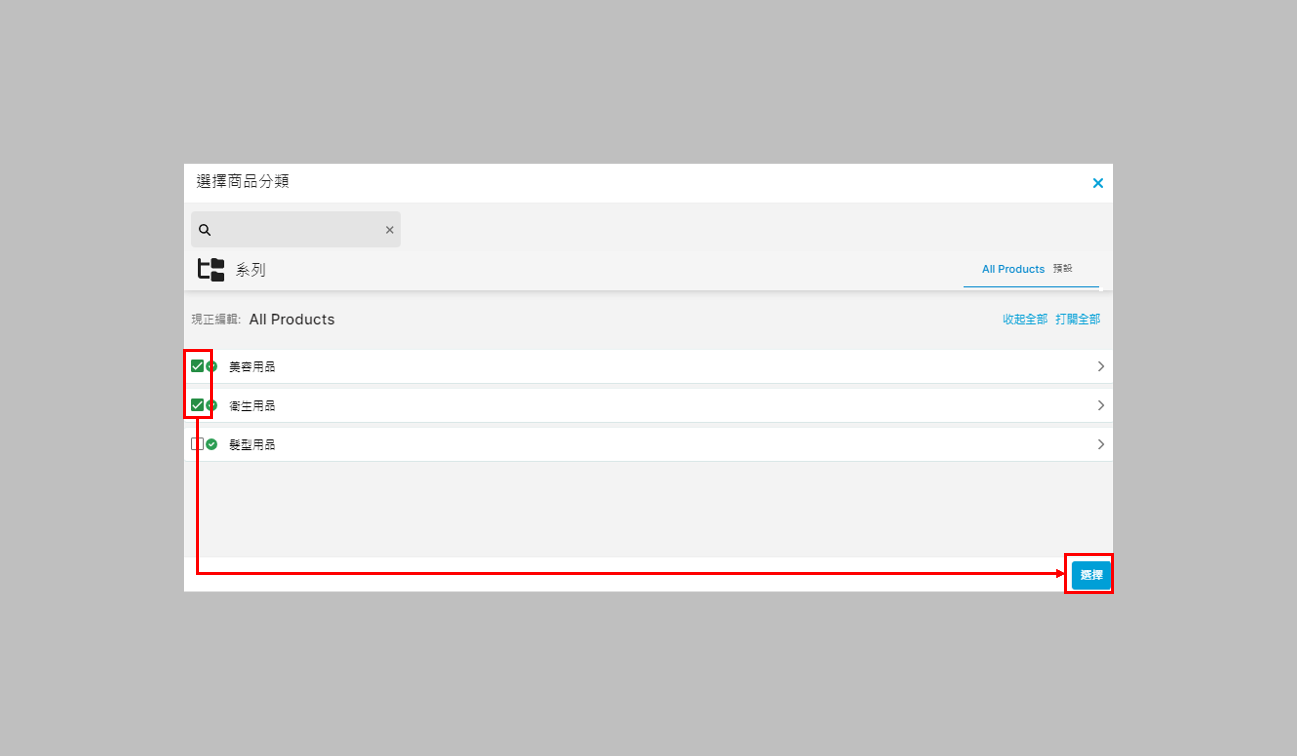 - 指定分類:優惠券只適用於已選分類內的商品,步驟如下: