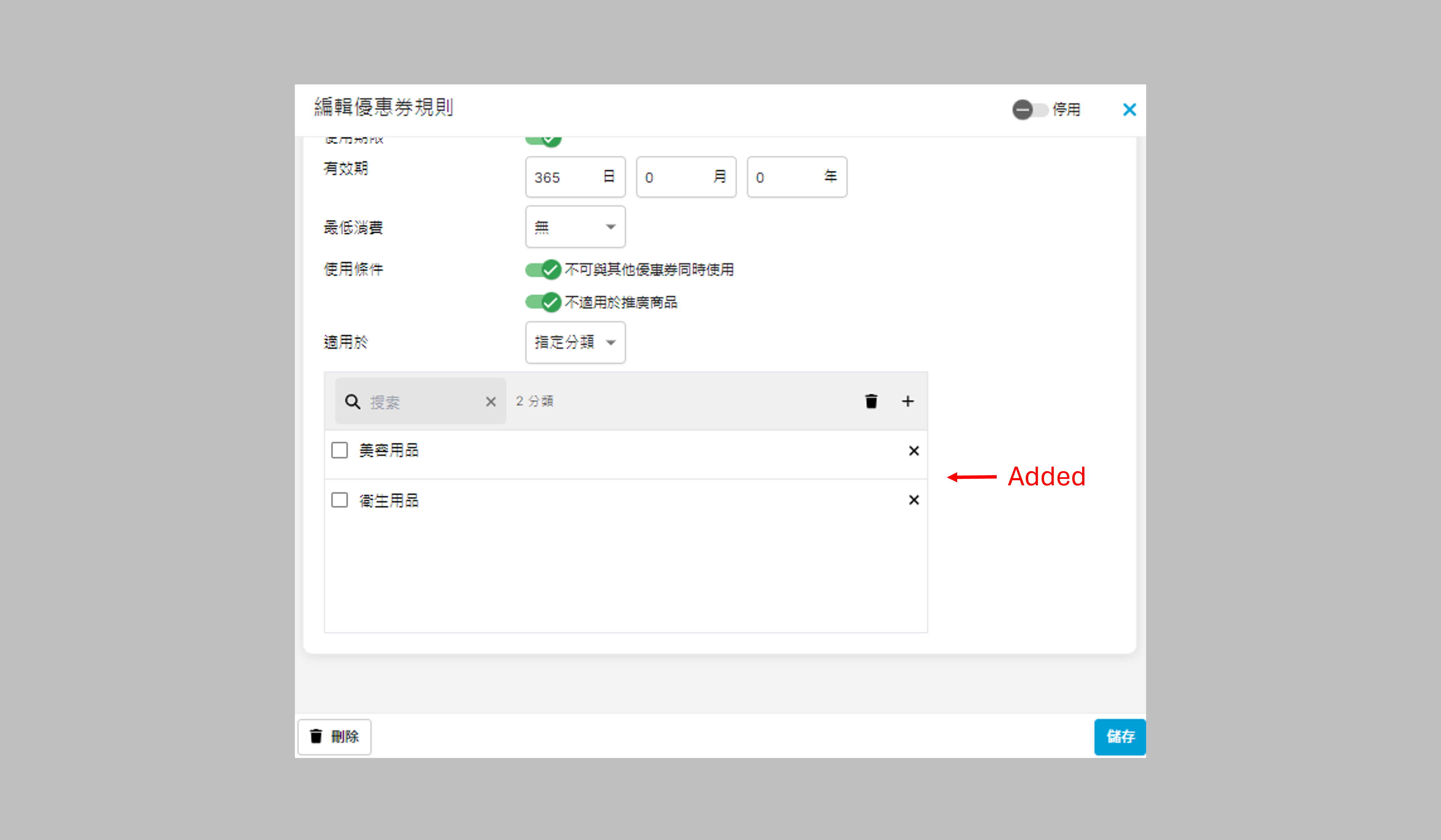 刪除優惠券規則 按照以上「編輯優惠券規則」步驟,點擊左下方的 「刪除」即可刪除該優惠券規則。