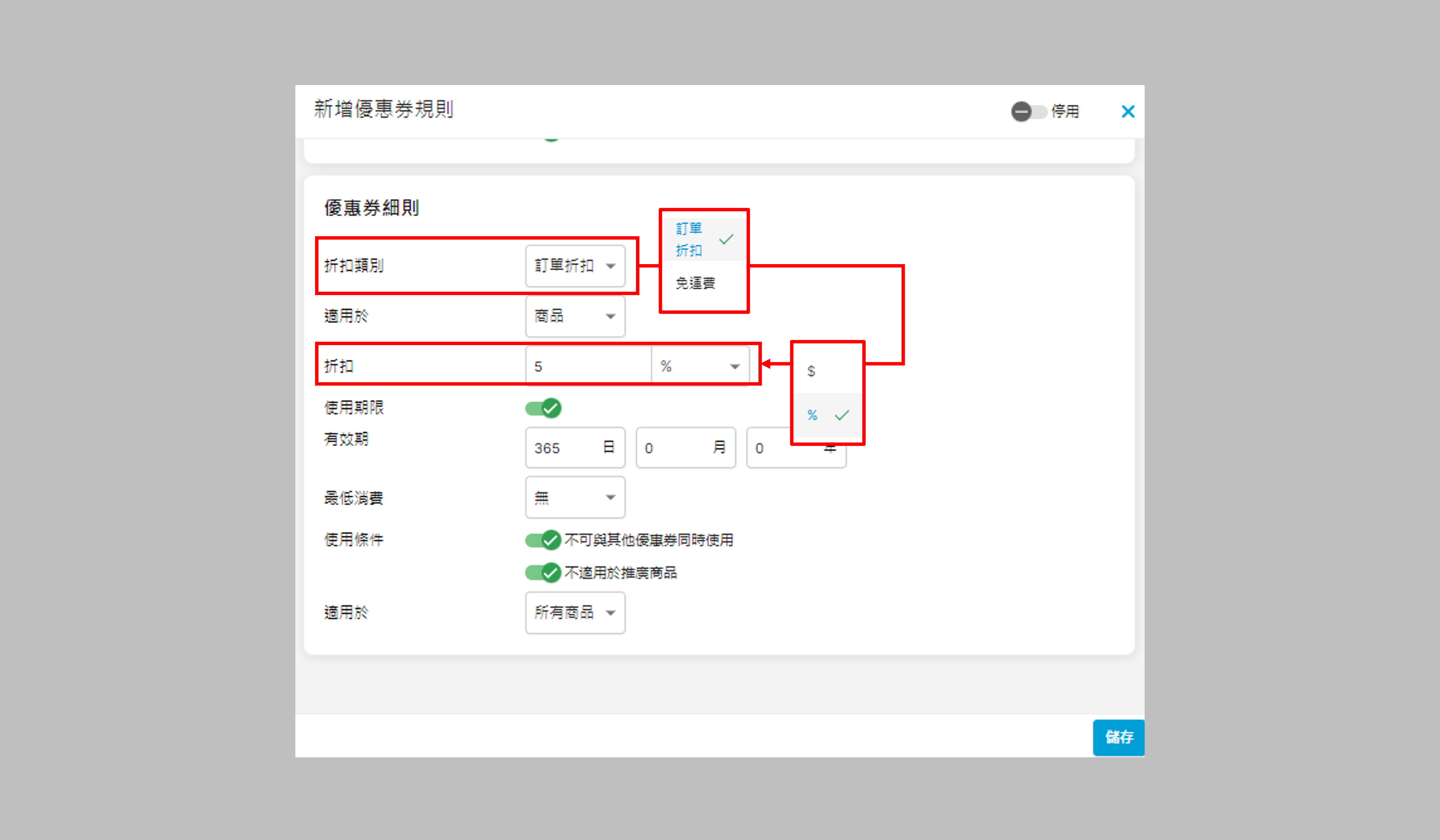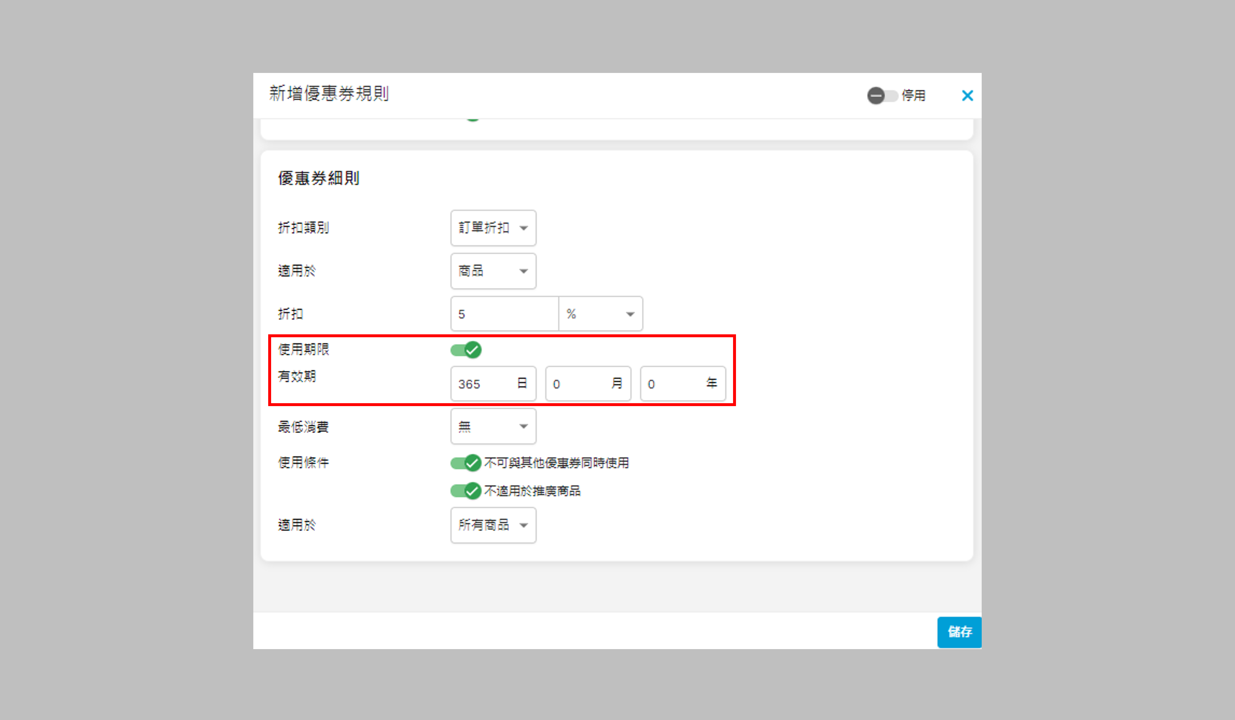 - 使用期限:優惠券的使用期限,例如只有1年有限期,便輸入365(日)0(月)0(年)