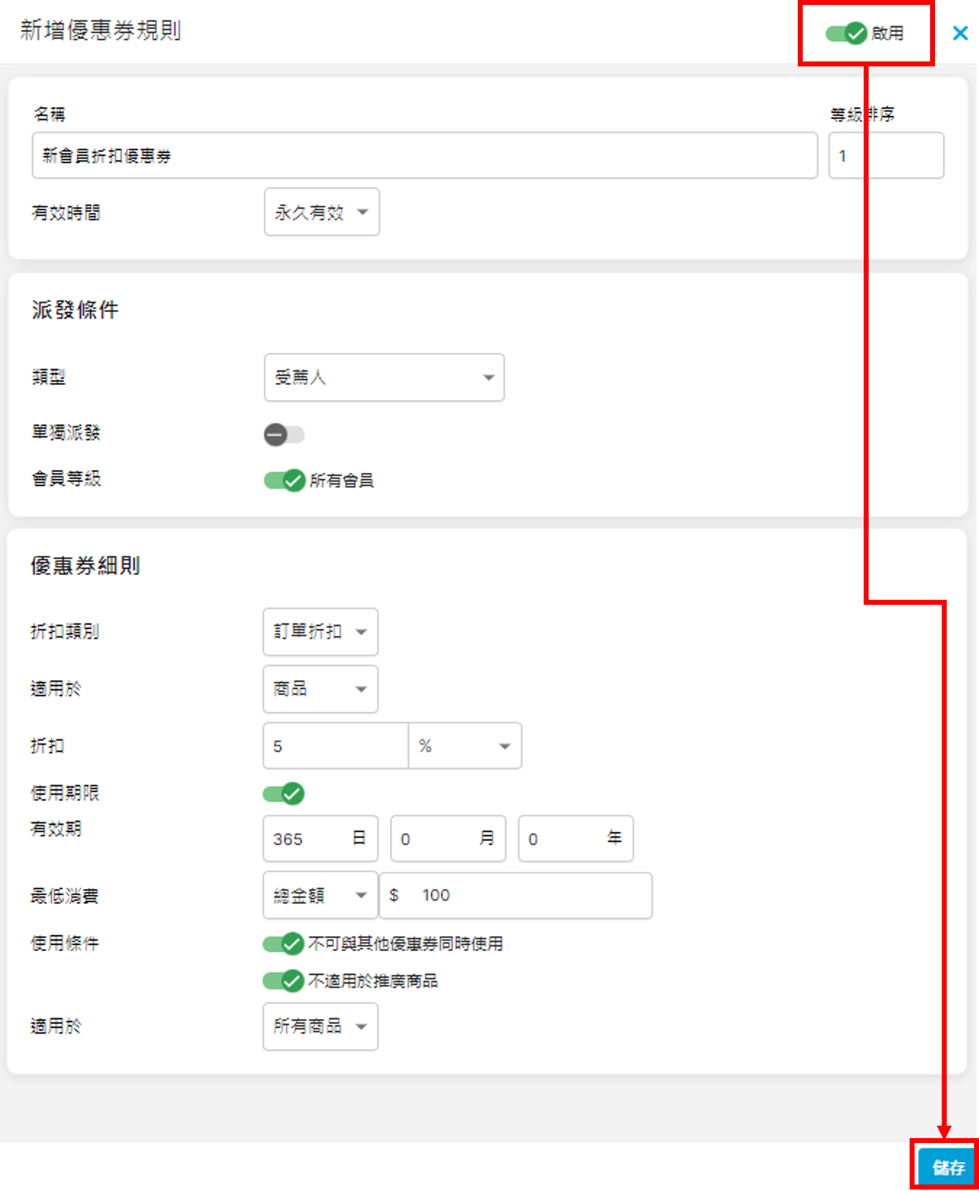 步驟三:啟用並儲存優惠券規則