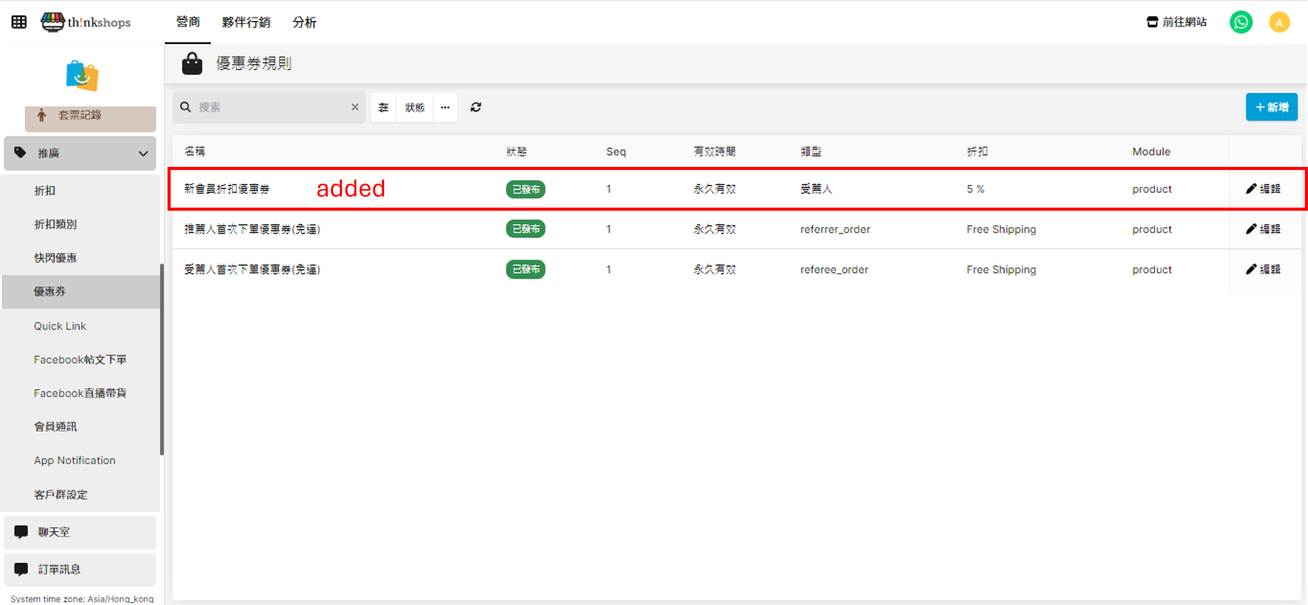 步驟一:新增優惠券規則 進入選單位置後按「新增」。