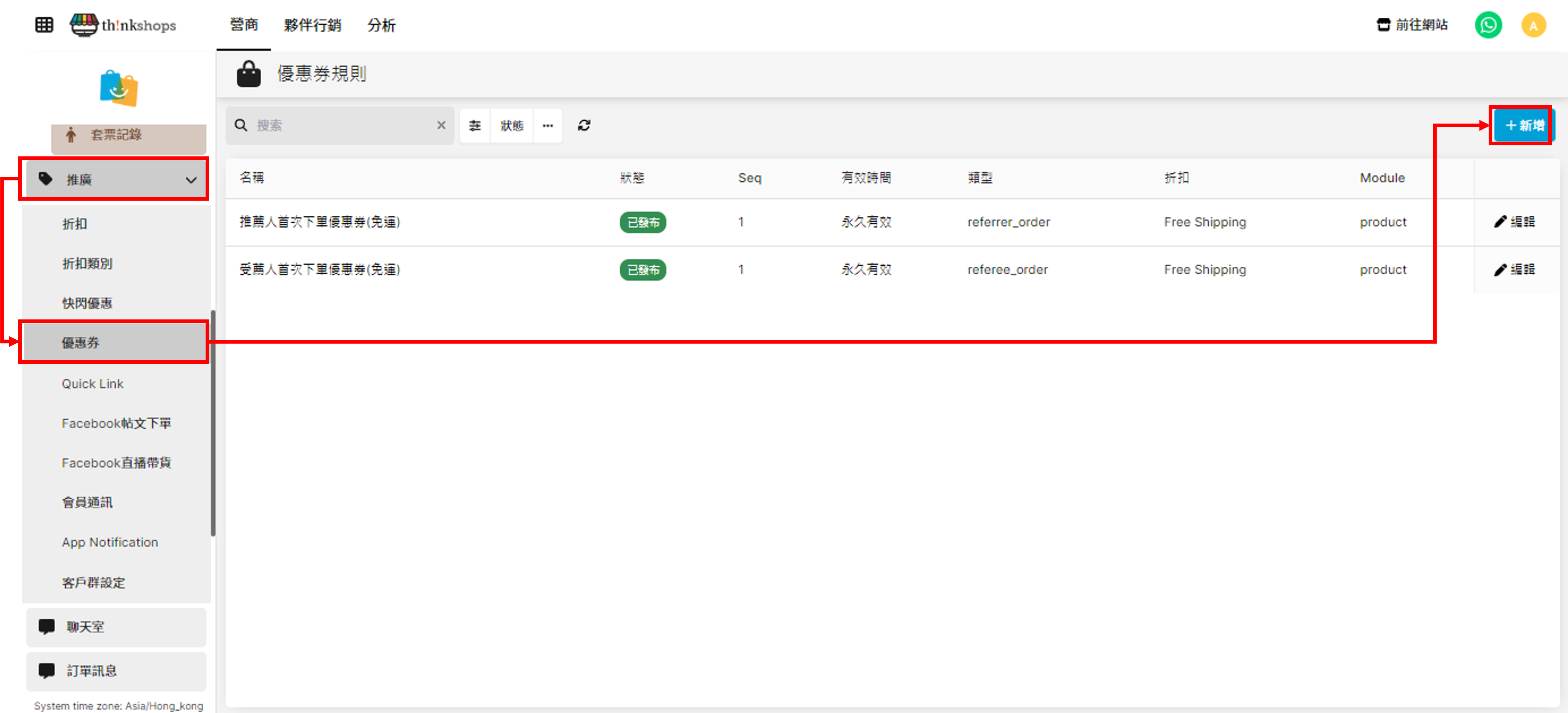 - 受薦人首次下單優惠券 選單位置: 在後台頁面左側選單點撃「推廣」並點擊「優惠券」即可進入頁面。