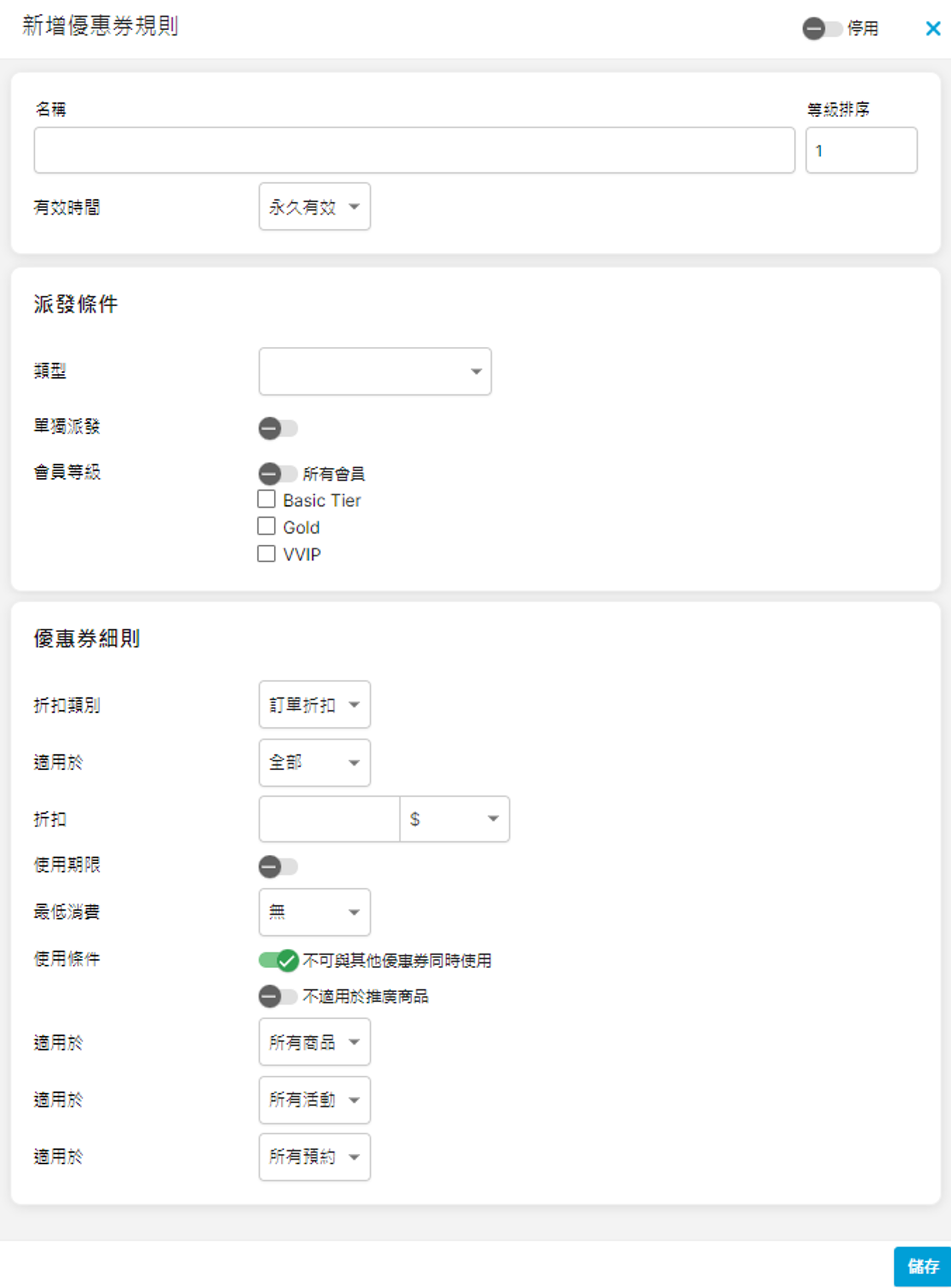 - 不可與其他優惠券同時使用:如勾選此項,會員每次結算時只可使用一張優惠券