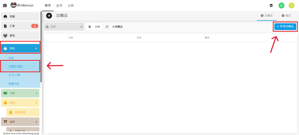 前往「ThinkShops後台 > 商品 > 加購品/禮品」頁面,點按右上方「新增加購品」按鈕。