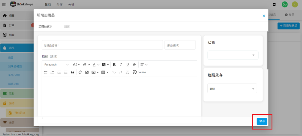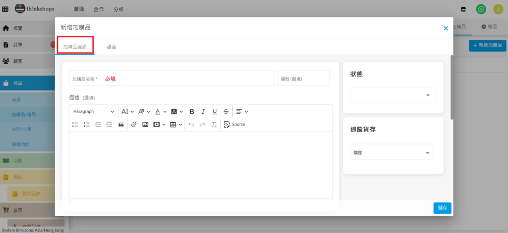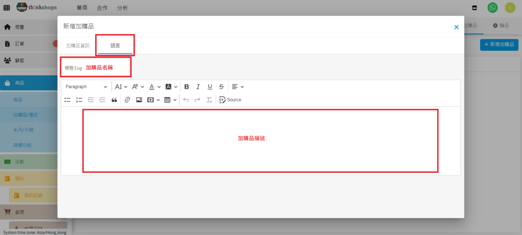 您的商店網站預設語言為中文,也設定了英文作網站的其他語言,您可以在「標題」一欄填寫英文加購品名稱;在描述空間內撰寫英文加購品描述。在顧客進入您的商店網站後,選擇語言為中文的顧客會看到中文加購品名稱及加購品描述;選擇語言為英文的顧客會看到英文加購品名稱及加購品描述。