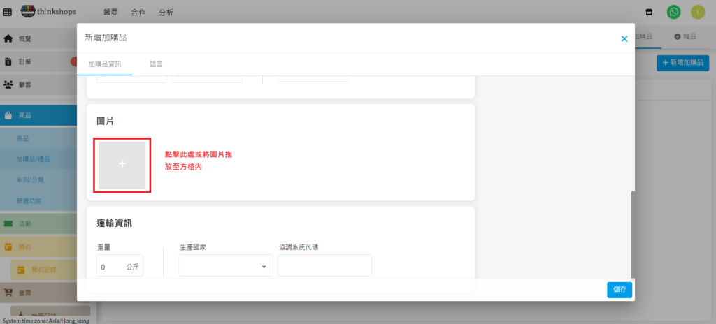 1. 點擊「帶有 + 號之灰色方格」,從電腦選擇加購品圖片進行上載。