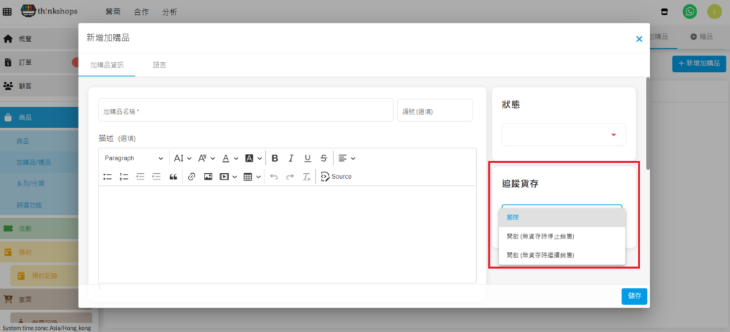 • 追蹤貨存:您可設置當無貨存時停止或繼續銷售該項商品。