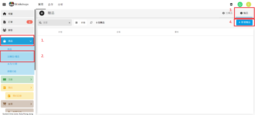 前往「ThinkShops後台 > 商品 > 加購品/禮品」頁面,點按右上方 按鈕再按「新增禮品」。