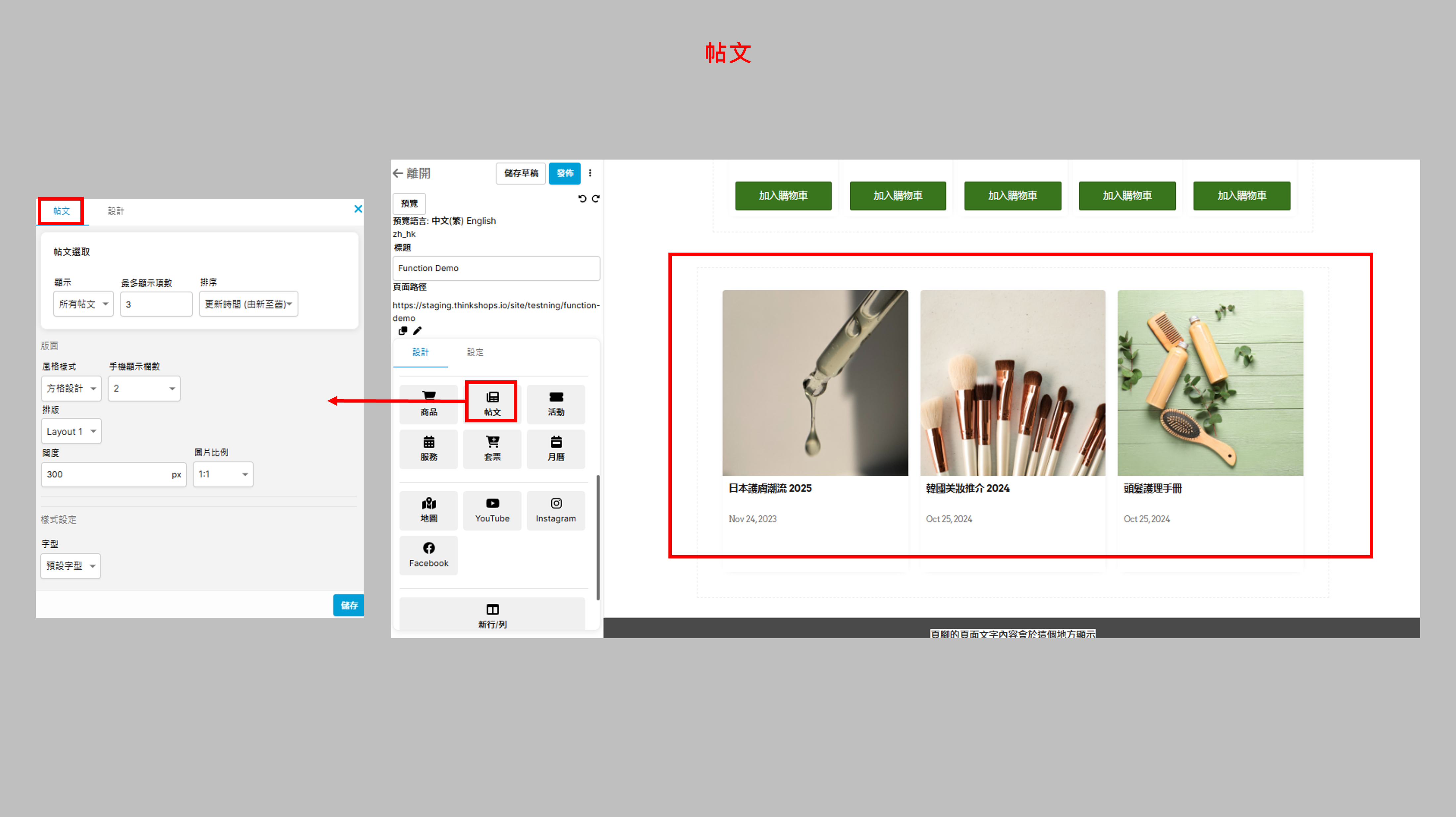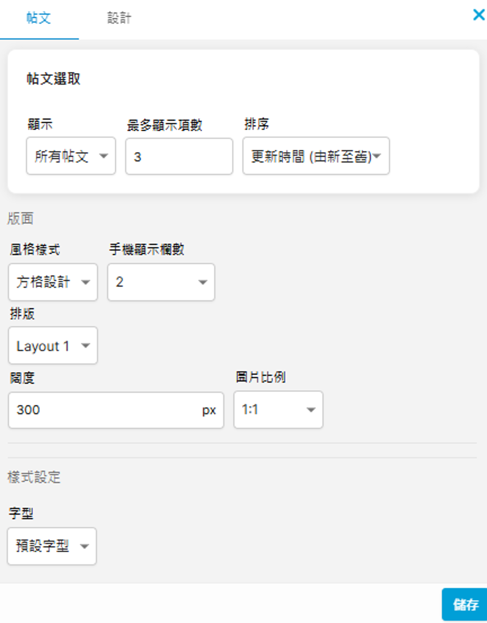 本頁導覽實用元素 二、帖文 您可於頁面中加入帖文,與顧客分享資訊。 帖文選取 顯示:選擇顯示「所有帖文」、「精選帖文」或「特定分類」中的帖文 最多顯示項數:設定最多顯示的帖文數目,如5篇 排序:帖文排序原則,例如按帖文的新增時間或更新時間 (註: 要設定「帖文」,請在後台主選單點選「帖文」,如您想編輯或增加帖文,可以瀏覽「網頁設計」的帖文設計和**帖文分類**。) 樣式設定 風格樣式:範例如下 闊度:每個帖文欄的闊度(px) 圖片比例:帖文圖片的比例,上圖範例是1:1 字型:帖文欄的文字字款 完成後按儲存。