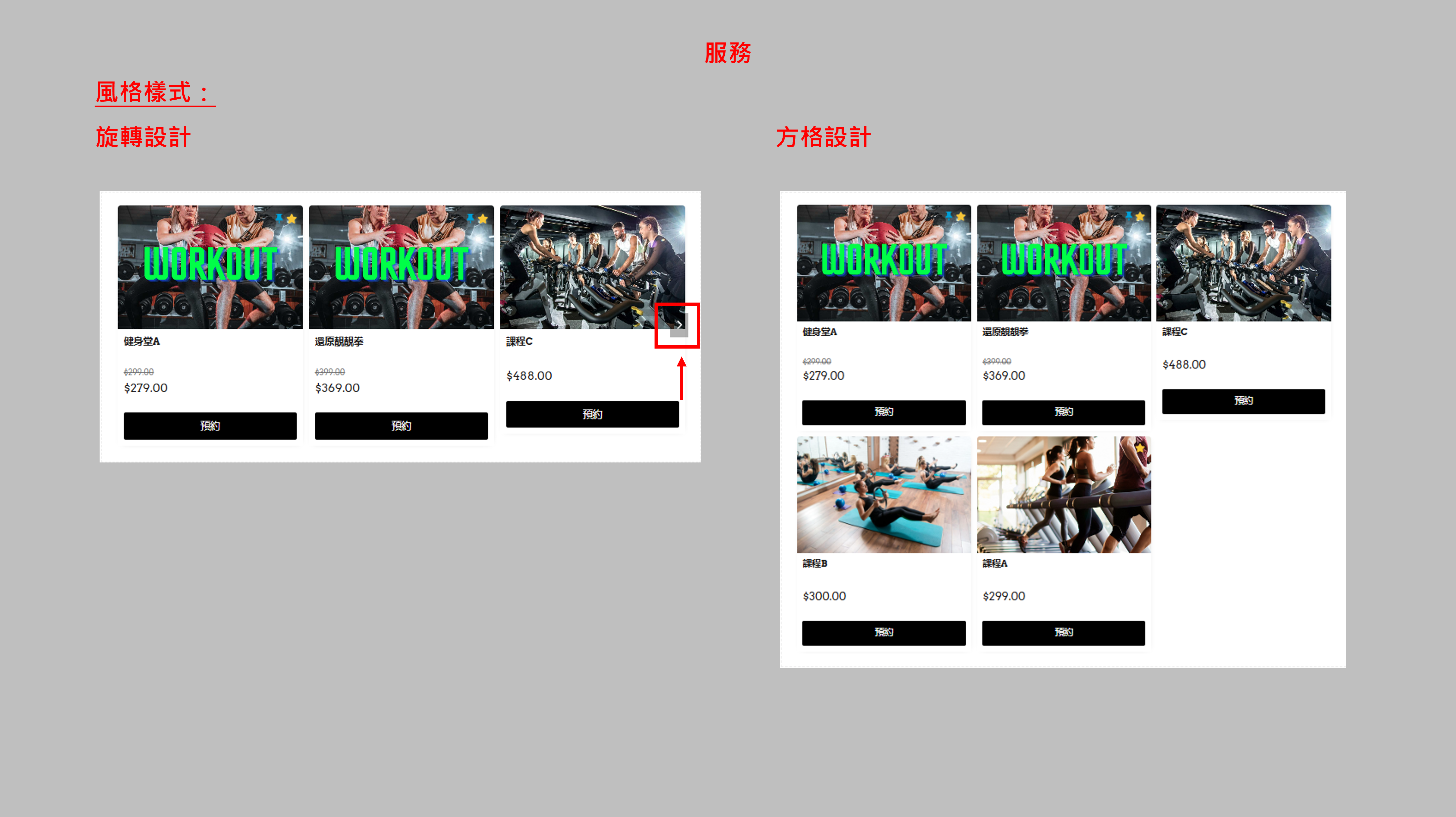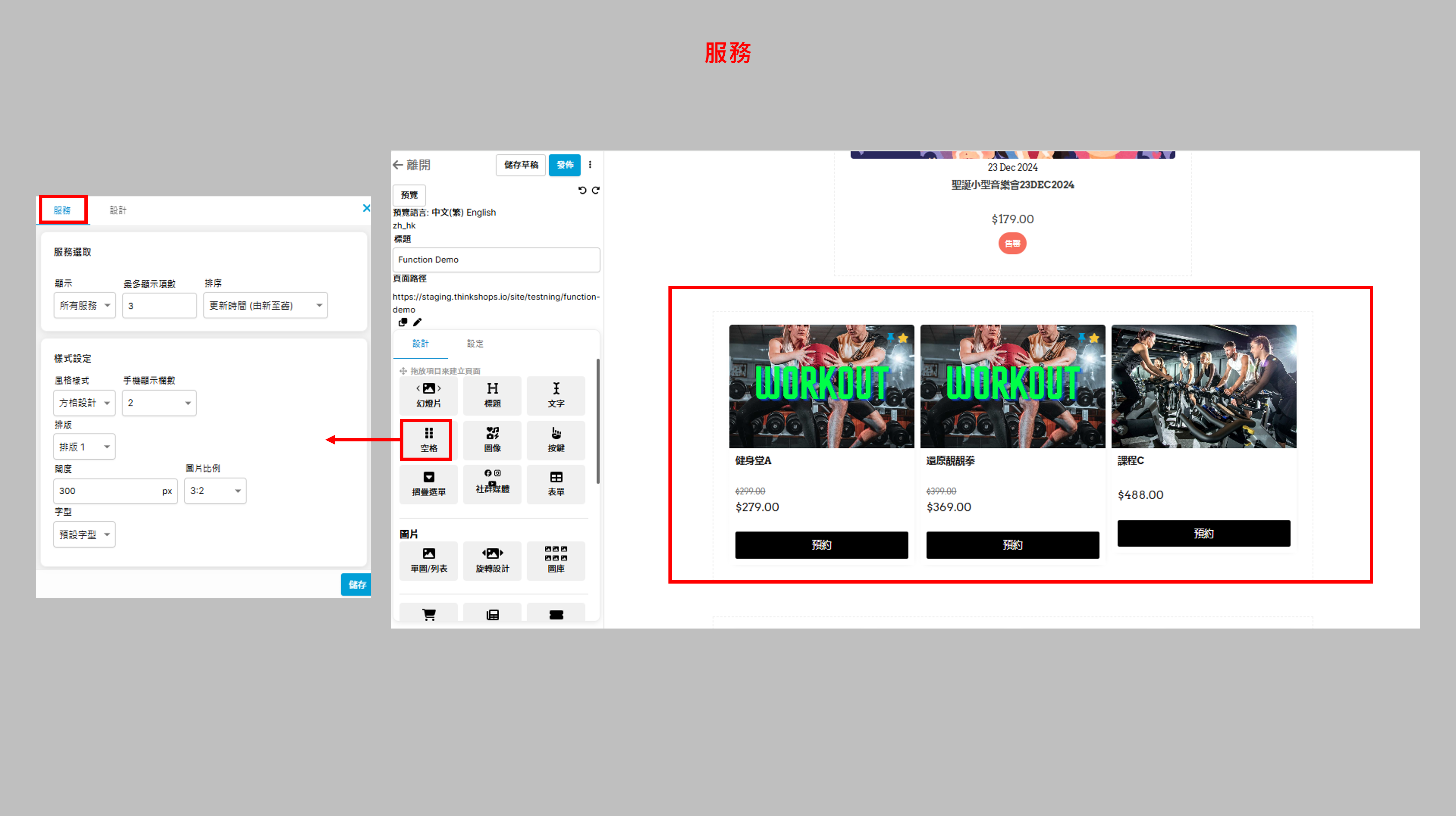 四、服務您可於頁面中加入服務作銷售。 服務選取 顯示:選擇顯示「所有服務」、「精選項目」或「特定分類」中的服務 最多顯示項數:設定最多顯示的服務數目,如5個 排序:服務排序原則,例如按服務的名稱或價格 (註: 要設定「服務」,請在後台主選單點選「預約」,如您想編輯或增加預約,可以瀏覽預約設定。) 樣式設定 風格樣式:範例如下 排版:範例如下 闊度:每個服務欄的闊度(px) 圖片比例:服務圖片的比例,上圖範例是3:2 字型:服務欄的文字字款 完成後按儲存。