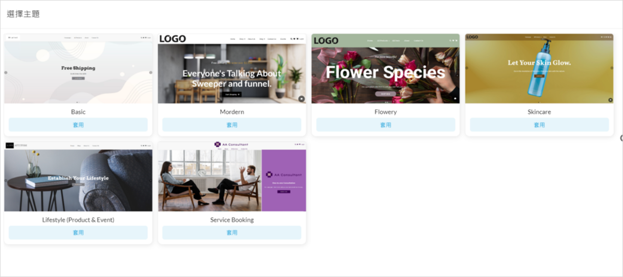 網站設計內容主題本頁導覽網站設計內容 主題 首次登入網站的後台後,您可即時選擇網站的頁面主題,ThinkShops提供了預設好的頁面主題,迎合您不同的需要。網頁的主題可隨時更換及編輯。 更換主題 點撃後台主頁左手邊的「設定」按鈕,選擇「網站」分欄的「主題」 點擊「瀏覽主題」 點擊「+主題」 您便可選擇一個預設主題,然後按「套用」