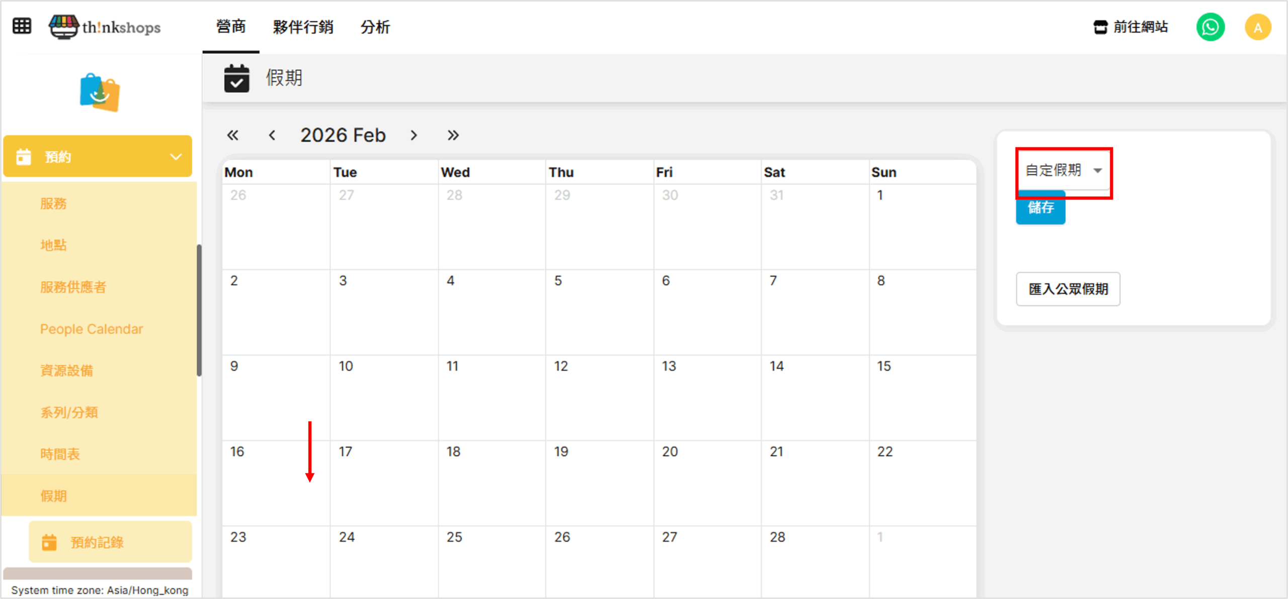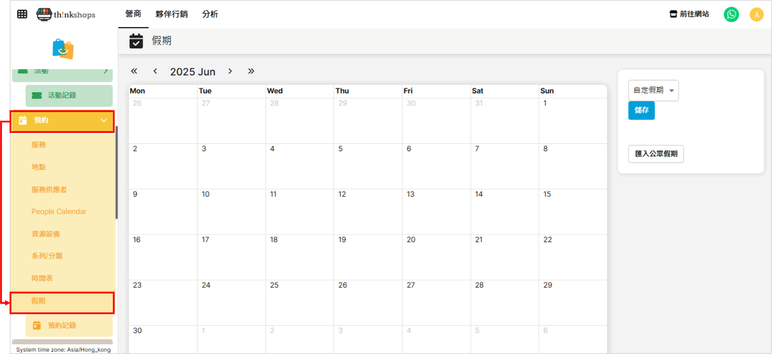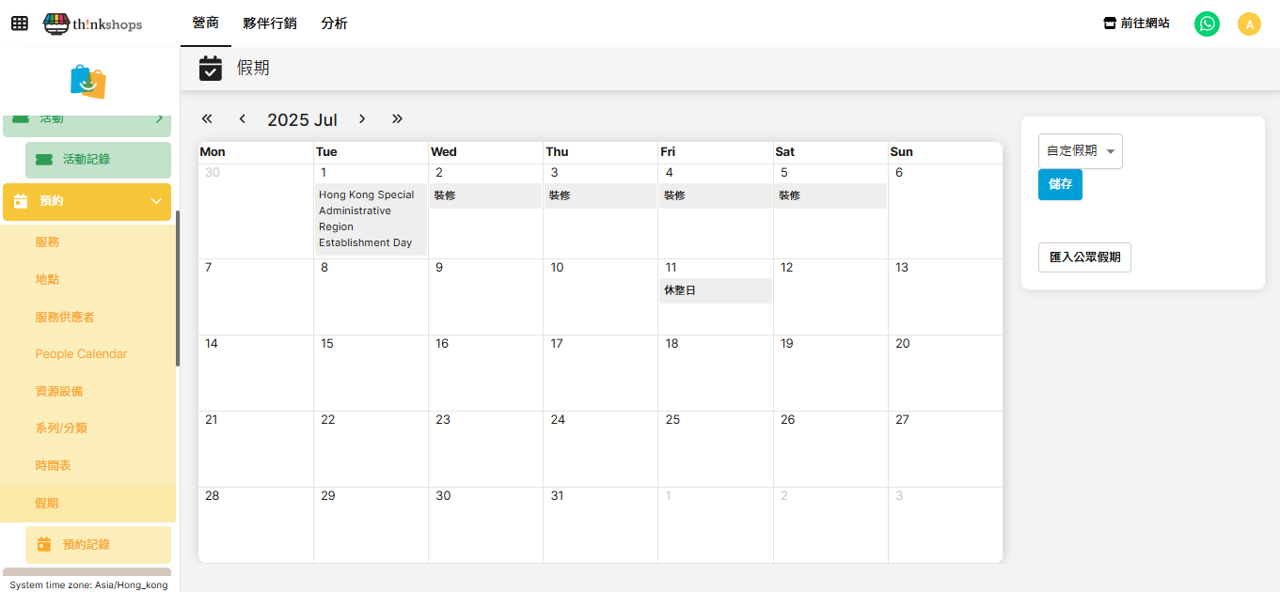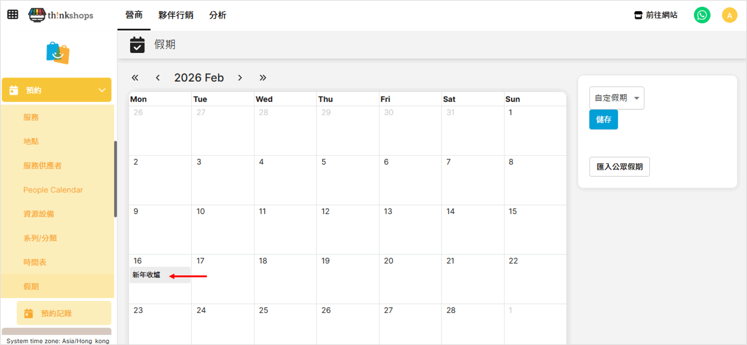 選單位置:於後台左方主選單按「預約」下的「假期」: