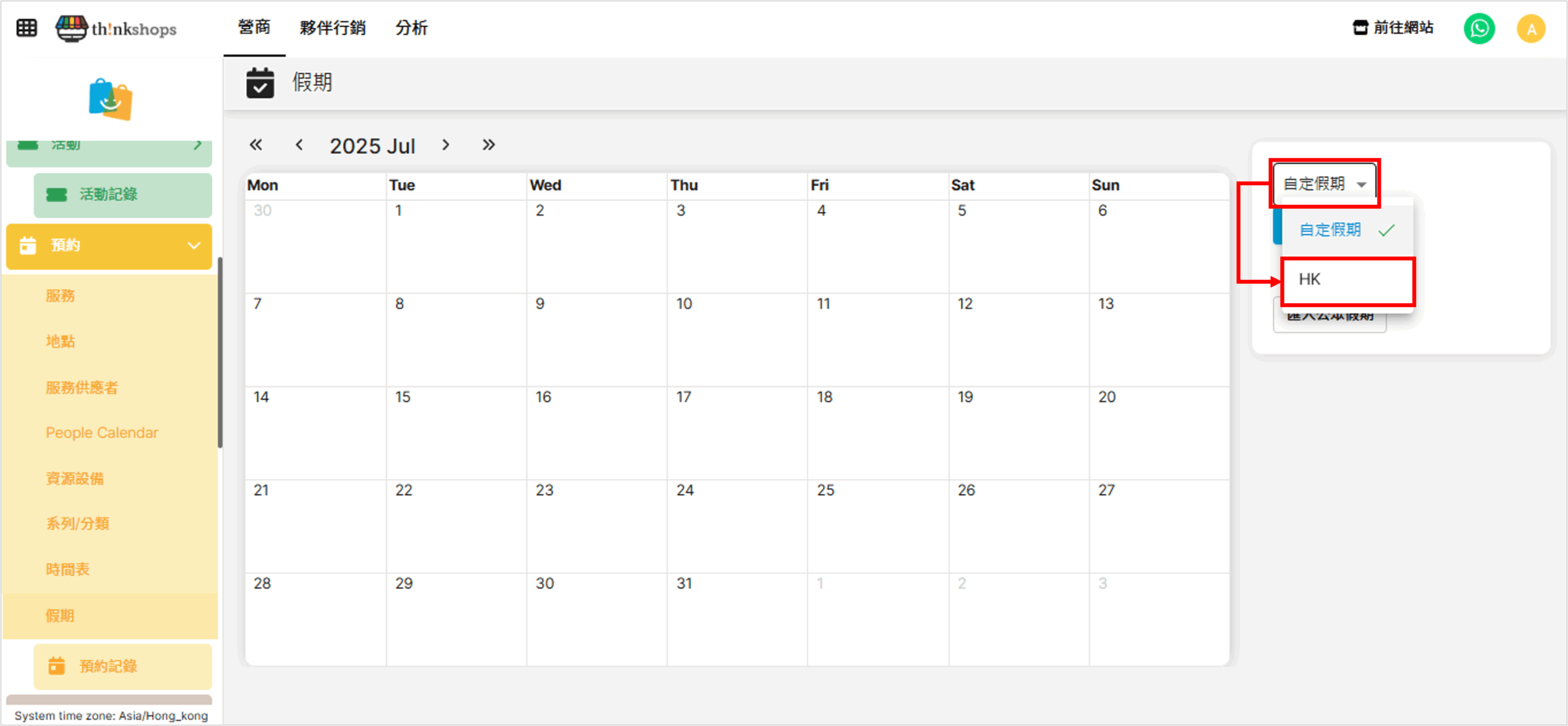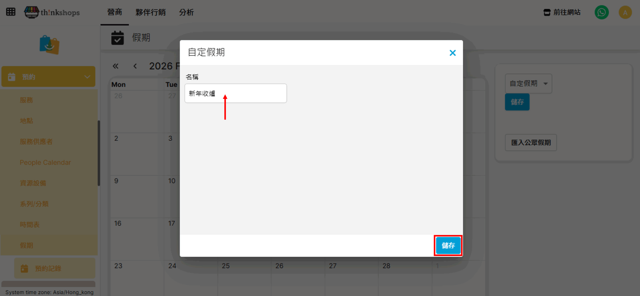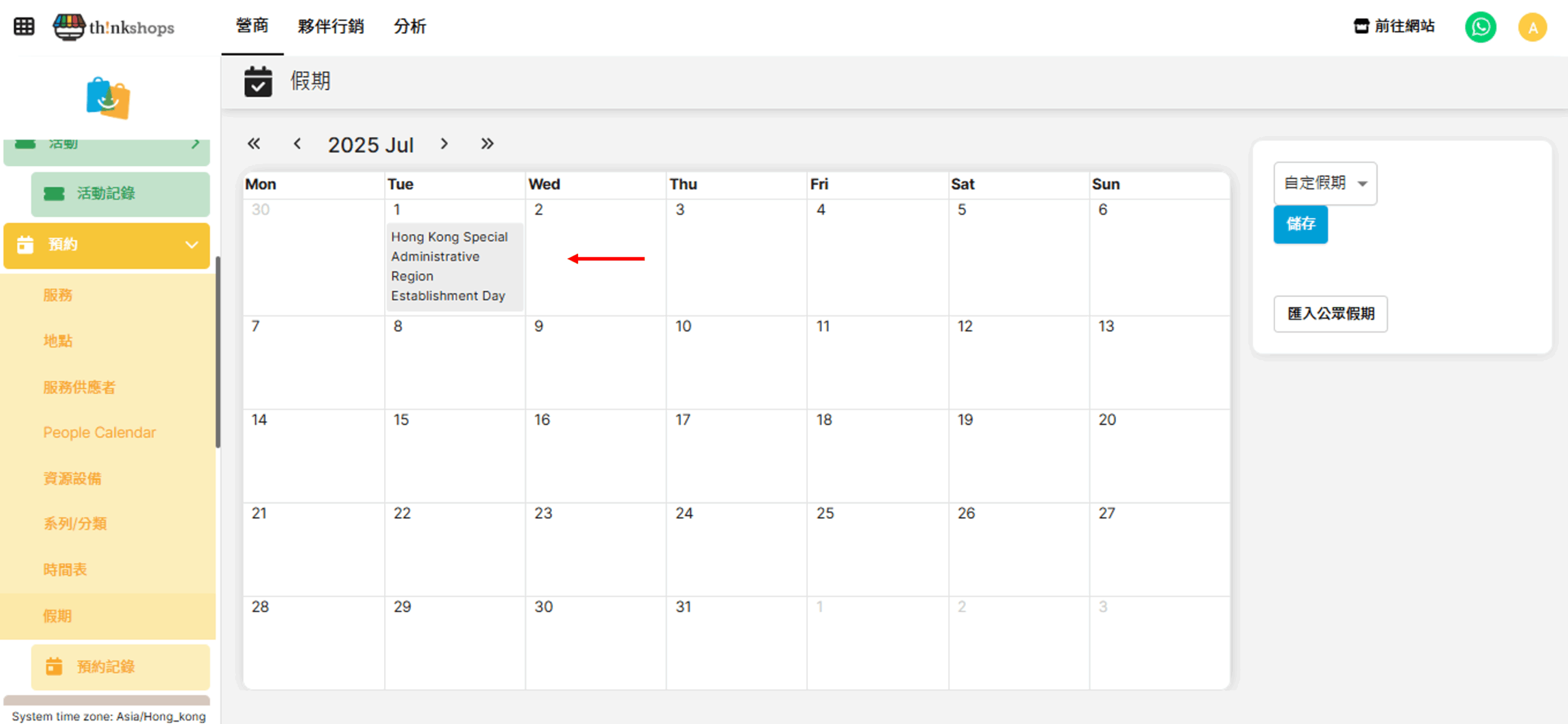 選單位置:於後台左方主選單按「預約」下的「假期」: