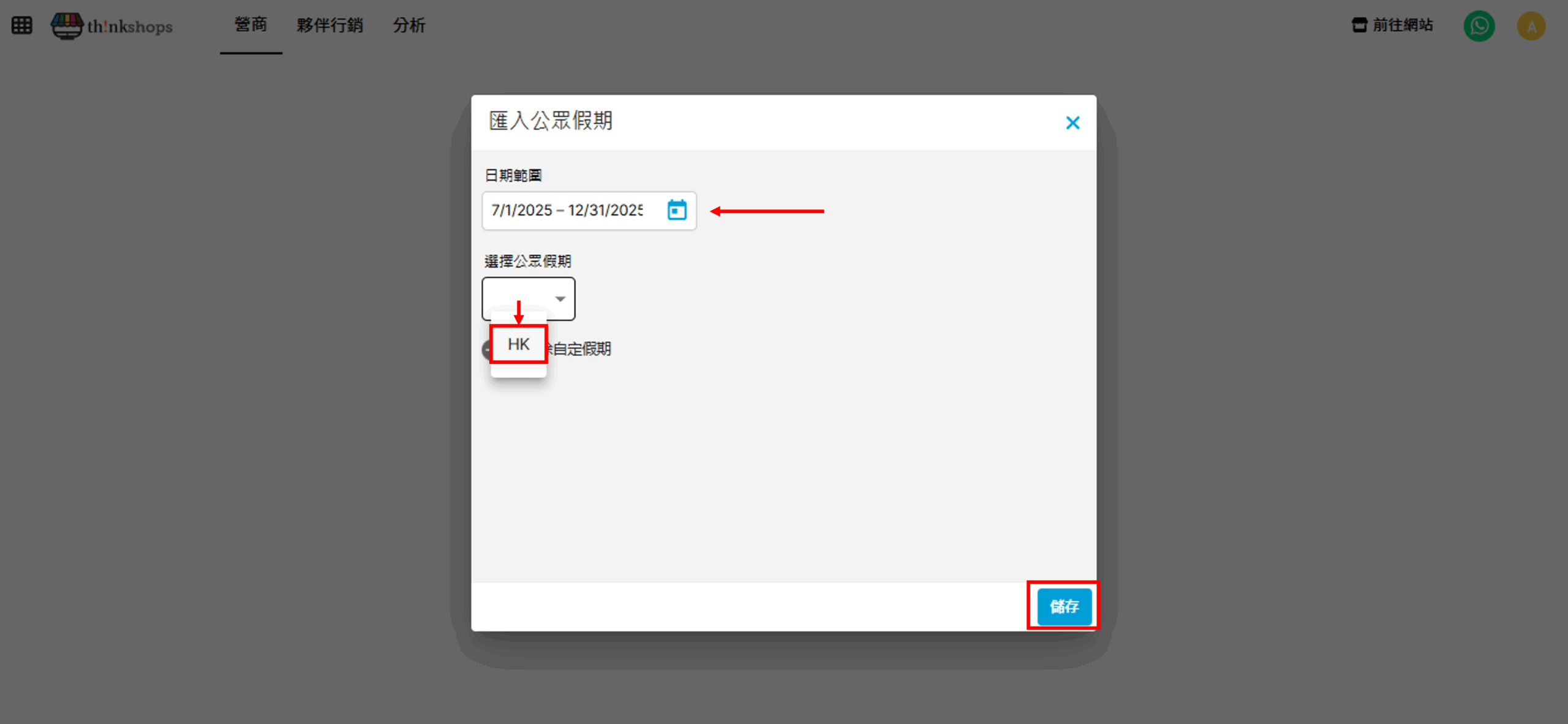 彈出列表後輸入日期範圍,匯入香港的法定公眾假期可需系統預設的「HK」,然後按「儲存」: