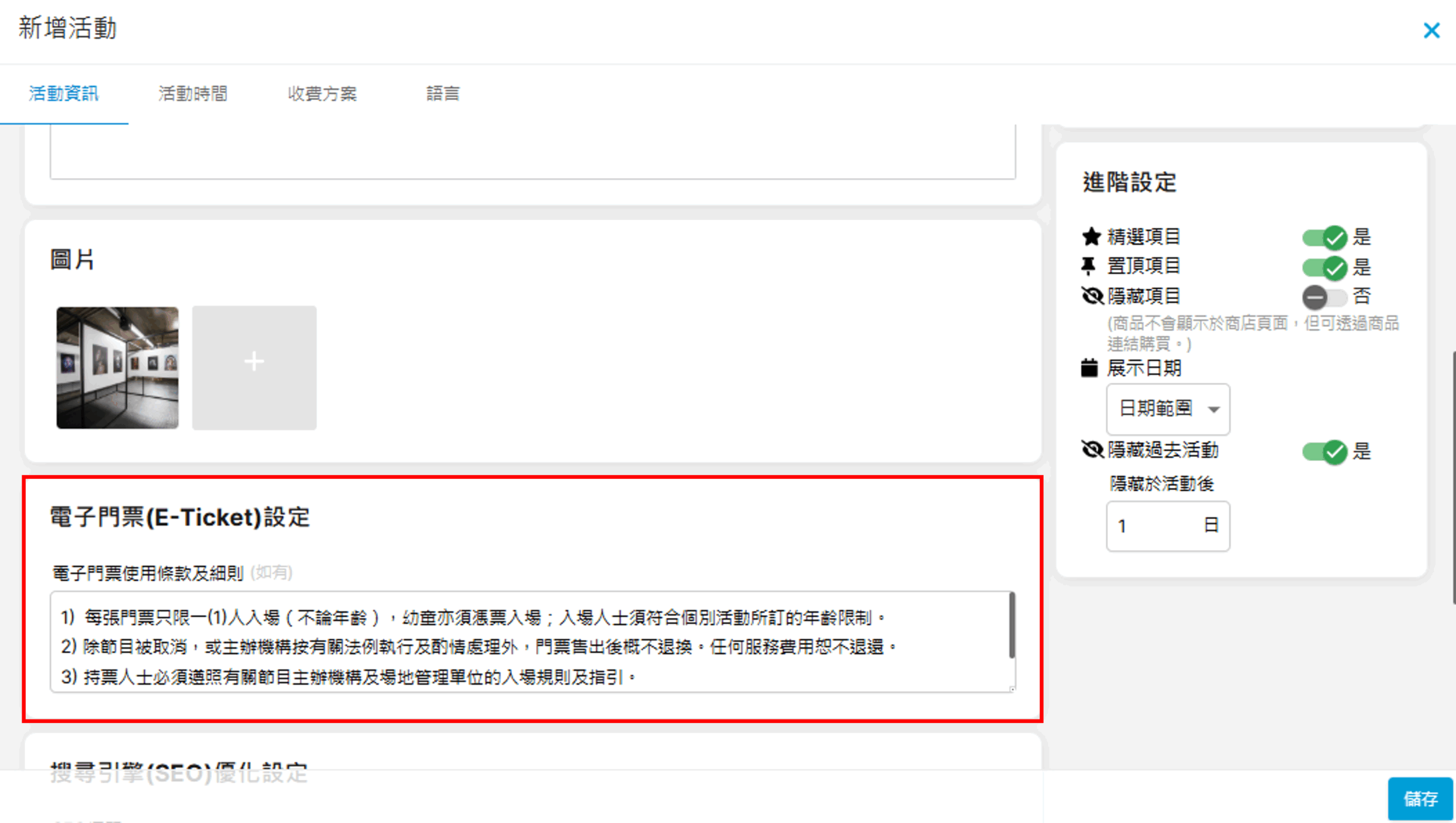 五、加入電子門票(E-Ticket)設定 如您有「電子門票使用條款及細則」要提示顧客,可輸入到這裡: