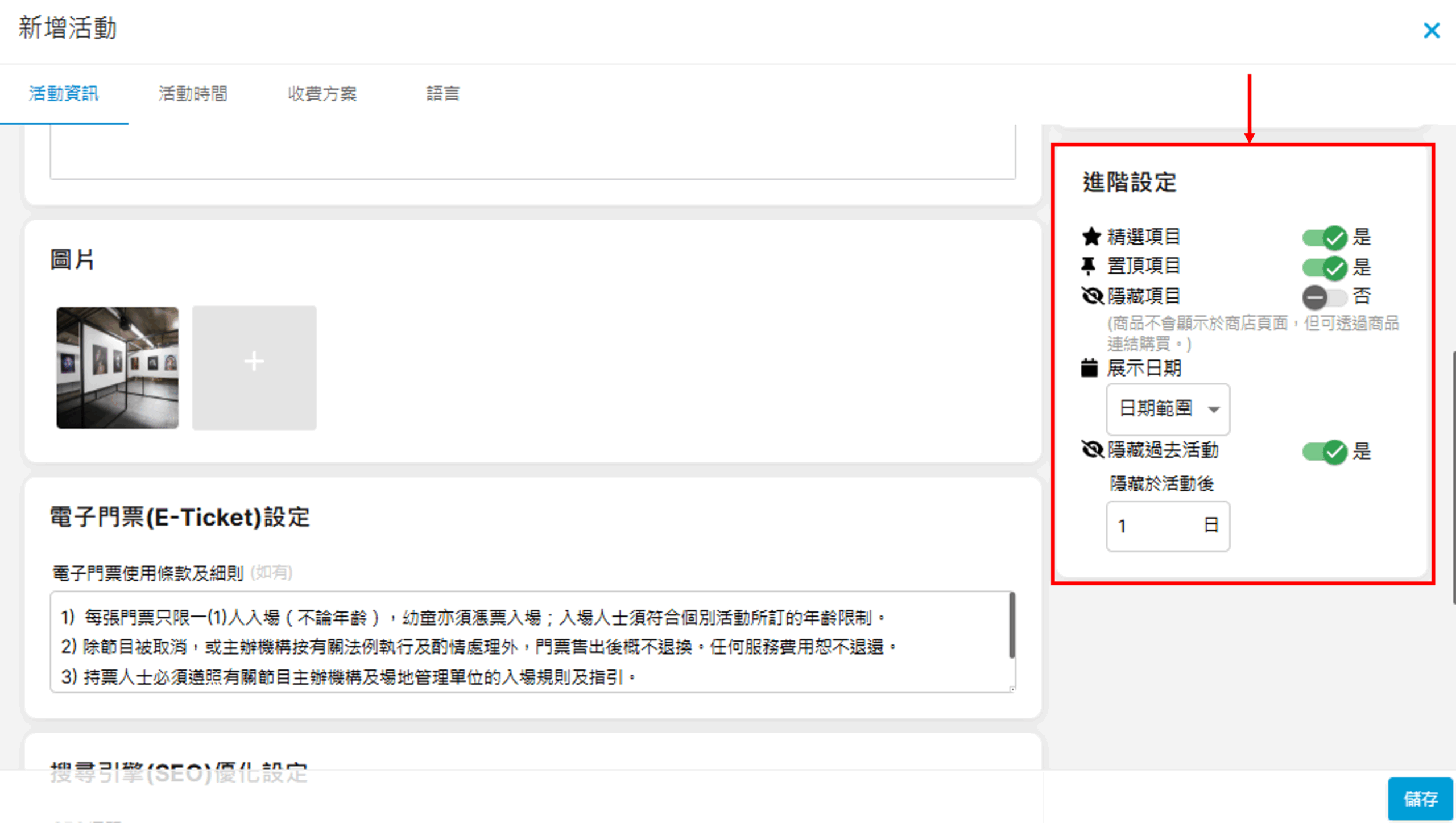 - 隱藏項目:是否於隱藏該活動不顯示於網站上,只透過連結發送給某些顧客
