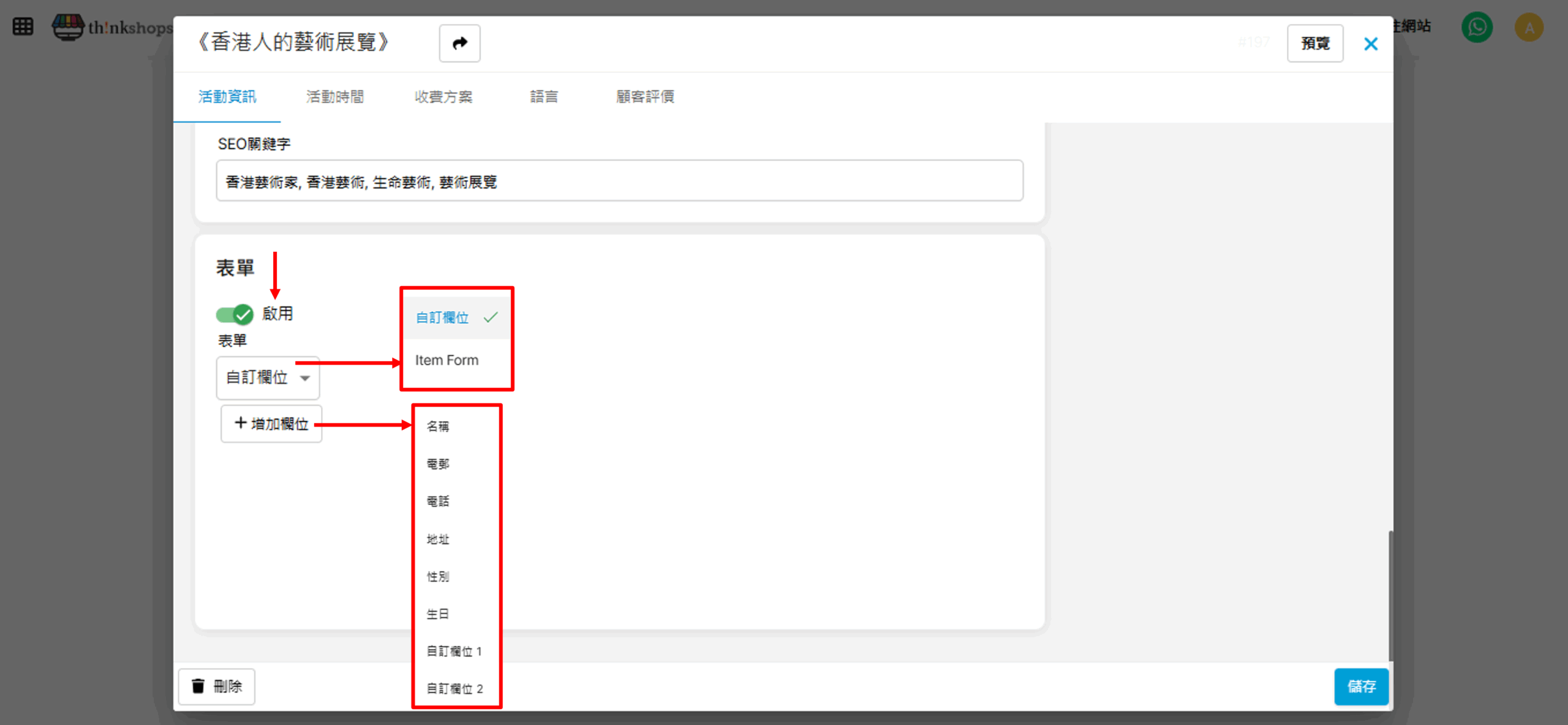 先點選啟用,然後選擇是自訂欄位或是選用現有的表單(需預先新增好表單這裡才可選擇該表單)。 *設定表單的方法可參考「網站設計內容> 表單設置」。 如選擇「自訂欄位」,便可按「+增加欄位」選擇需要增加的類型,例如是名稱、生日、電郵,亦可自訂欄位問題。 以上八個部分完成設定後,可跳至「活動時間」分頁,設定指引請參考本文下一章。