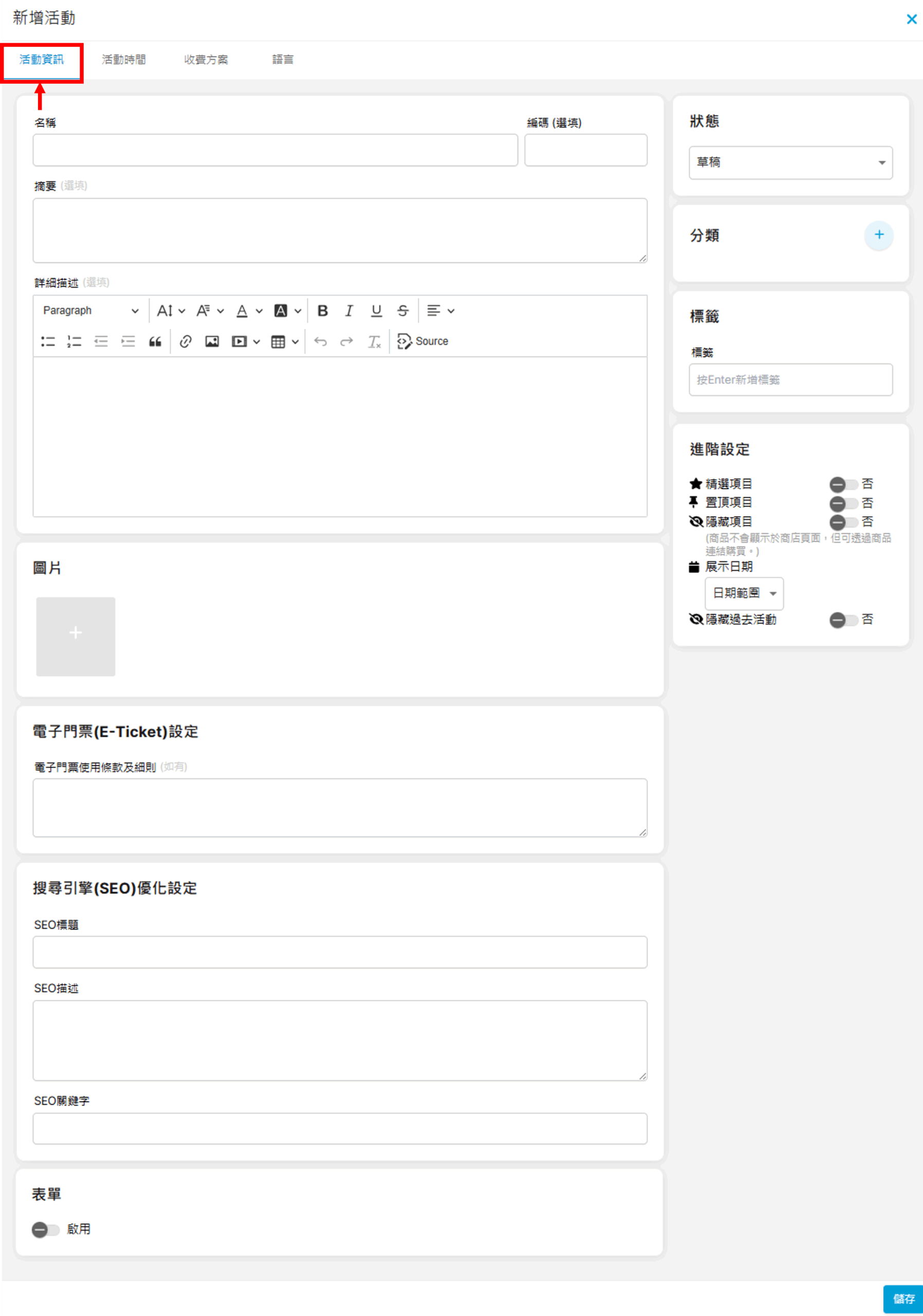 步驟一、輸入活動基本資訊 先輸入活動的名稱、編碼(選填)、摘要(選填)及詳細描述(選填)。並於「狀態」欄點選「啟用」(您亦可先儲存為「草稿」,待正式上架時才改為「啟用」)。