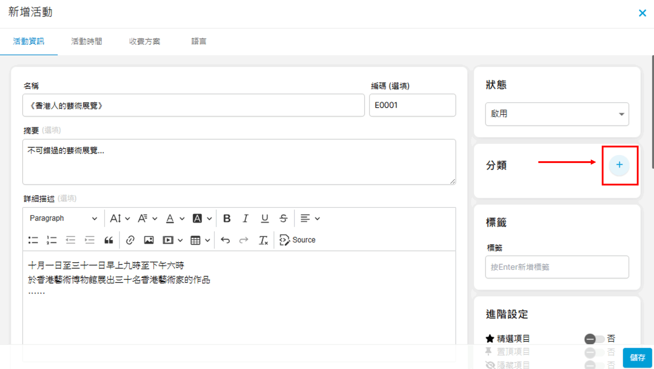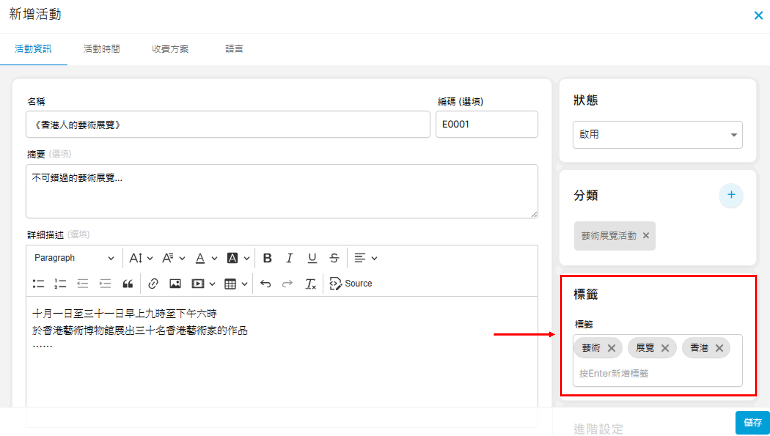 *設定活動分類的方法可參考「活動管理> 系列/分類」中的指引。 三、設定標籤(選填) 為活動加入標籤(輸入關鍵字後再按鍵盤Enter,再輸入下一個關鍵字):