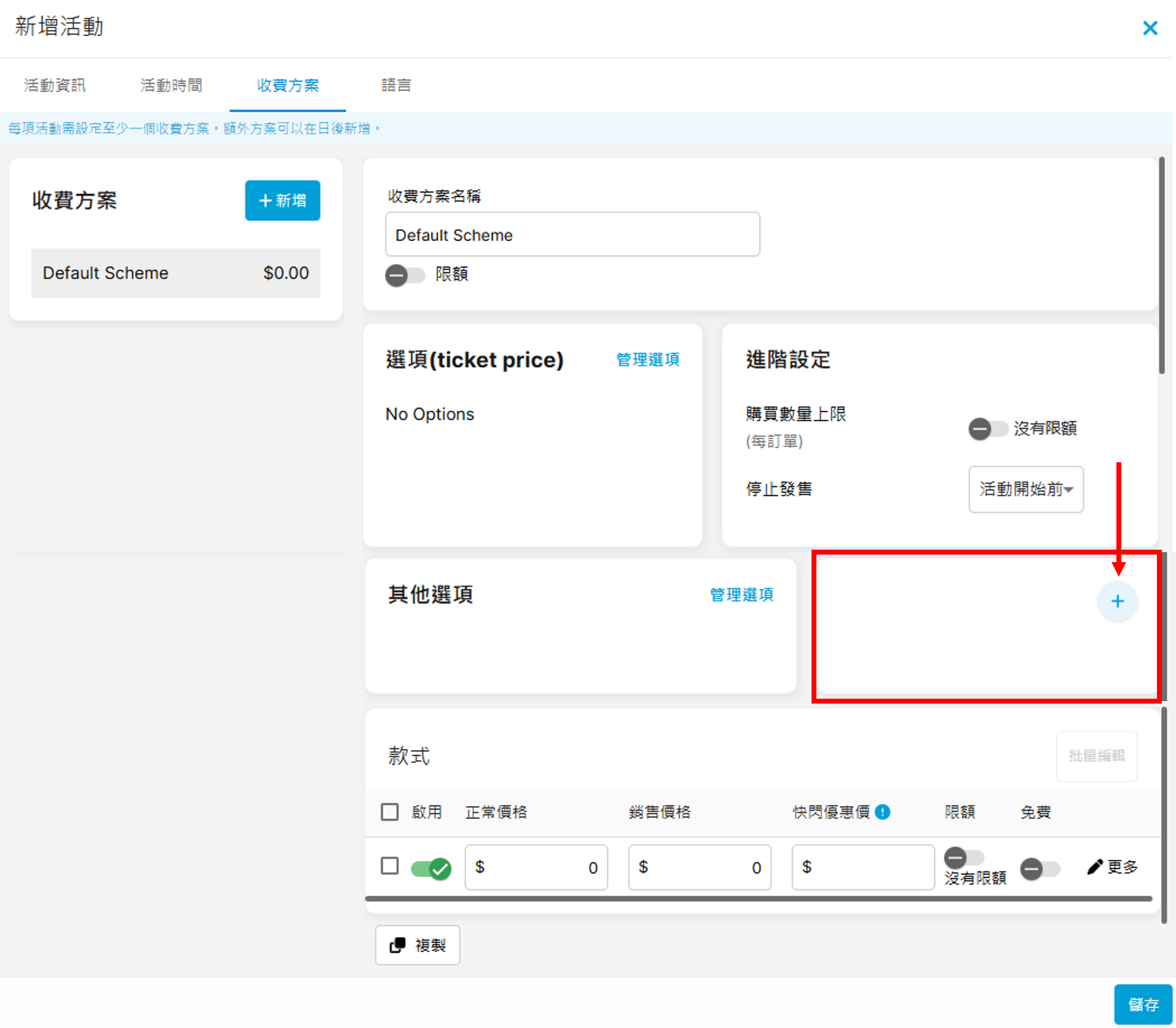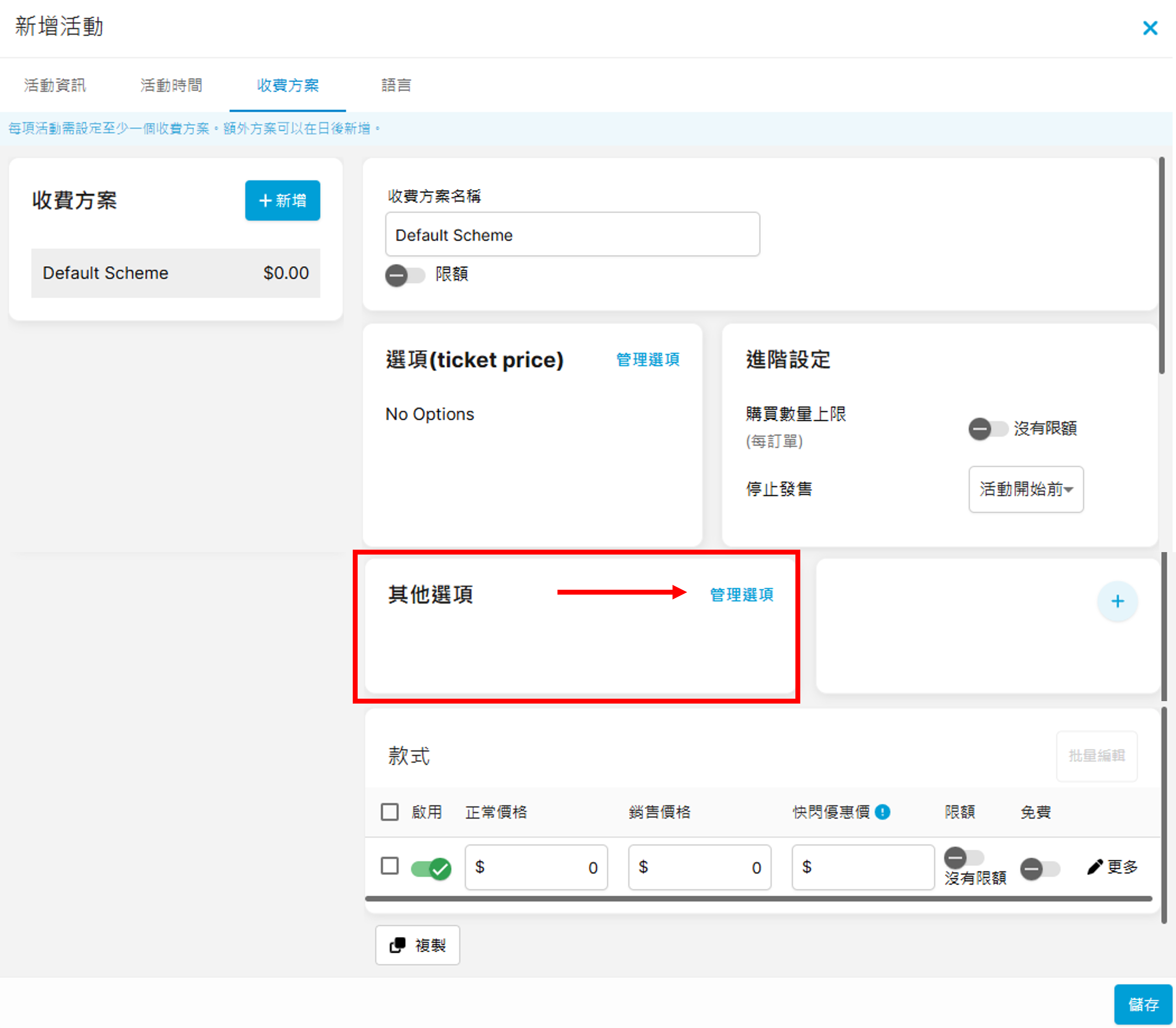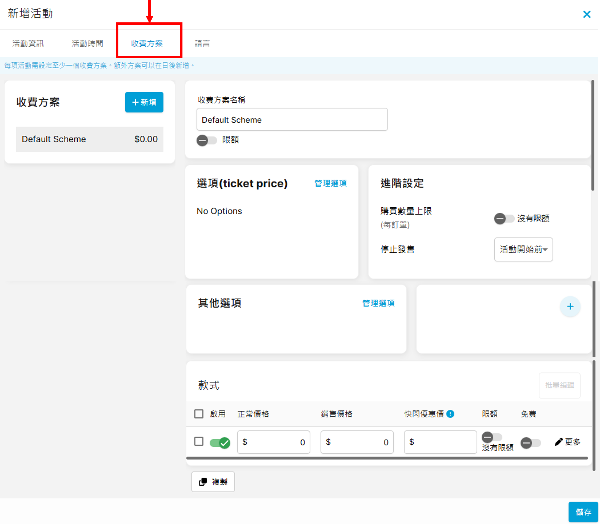 完成上方的「活動資訊」及「活動時間」後,可跳至「收費方案」分頁繼續進行設定:
