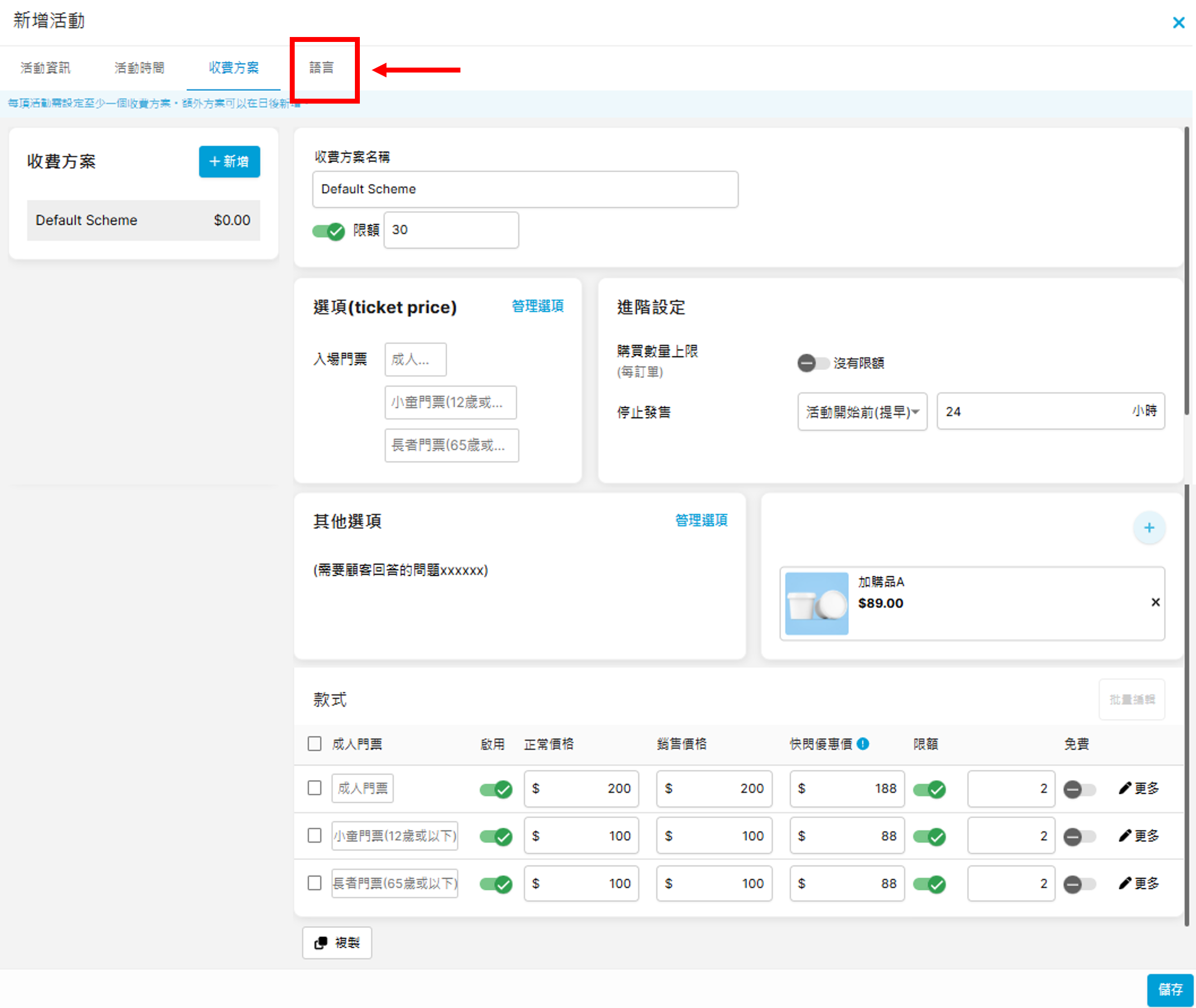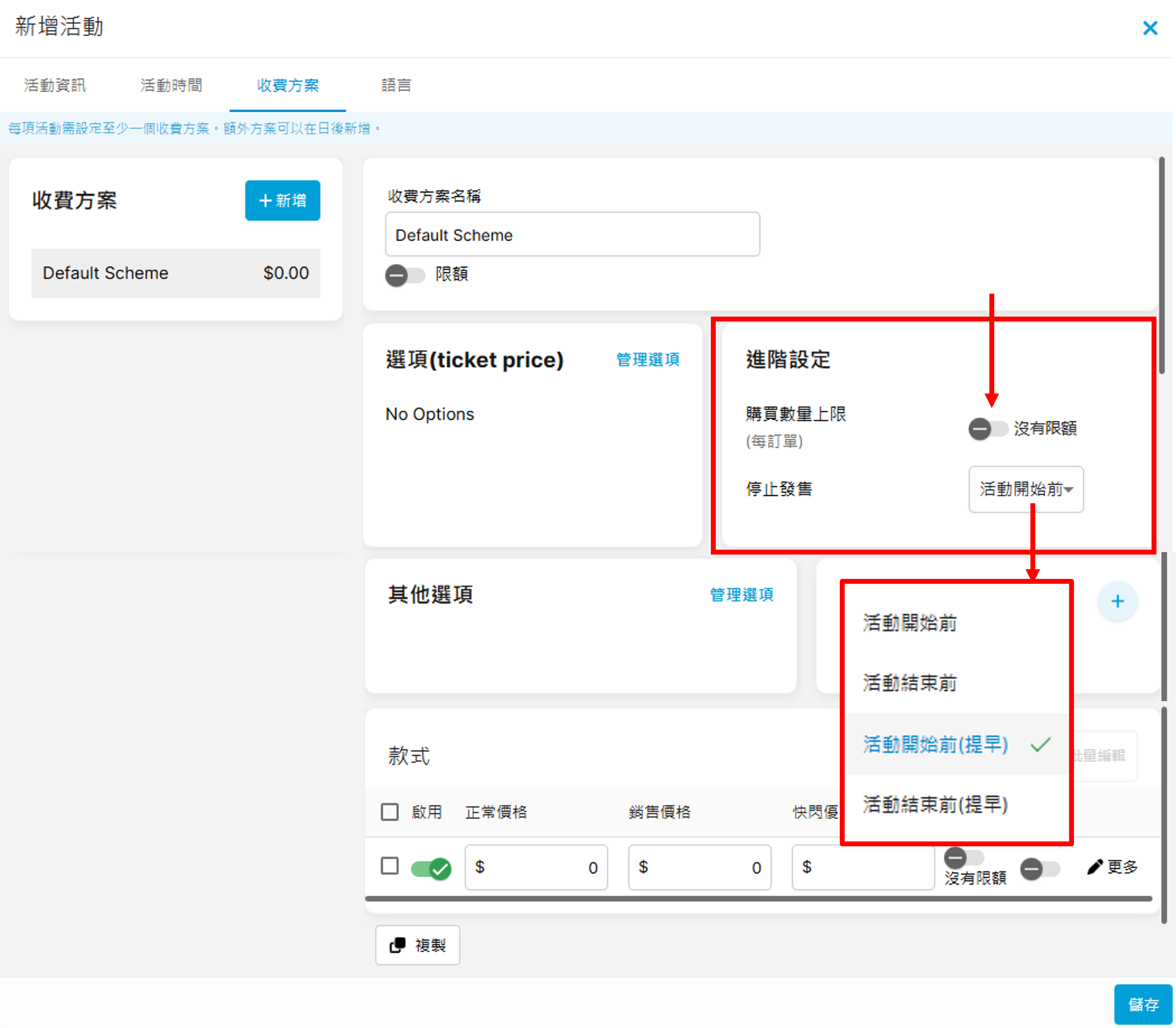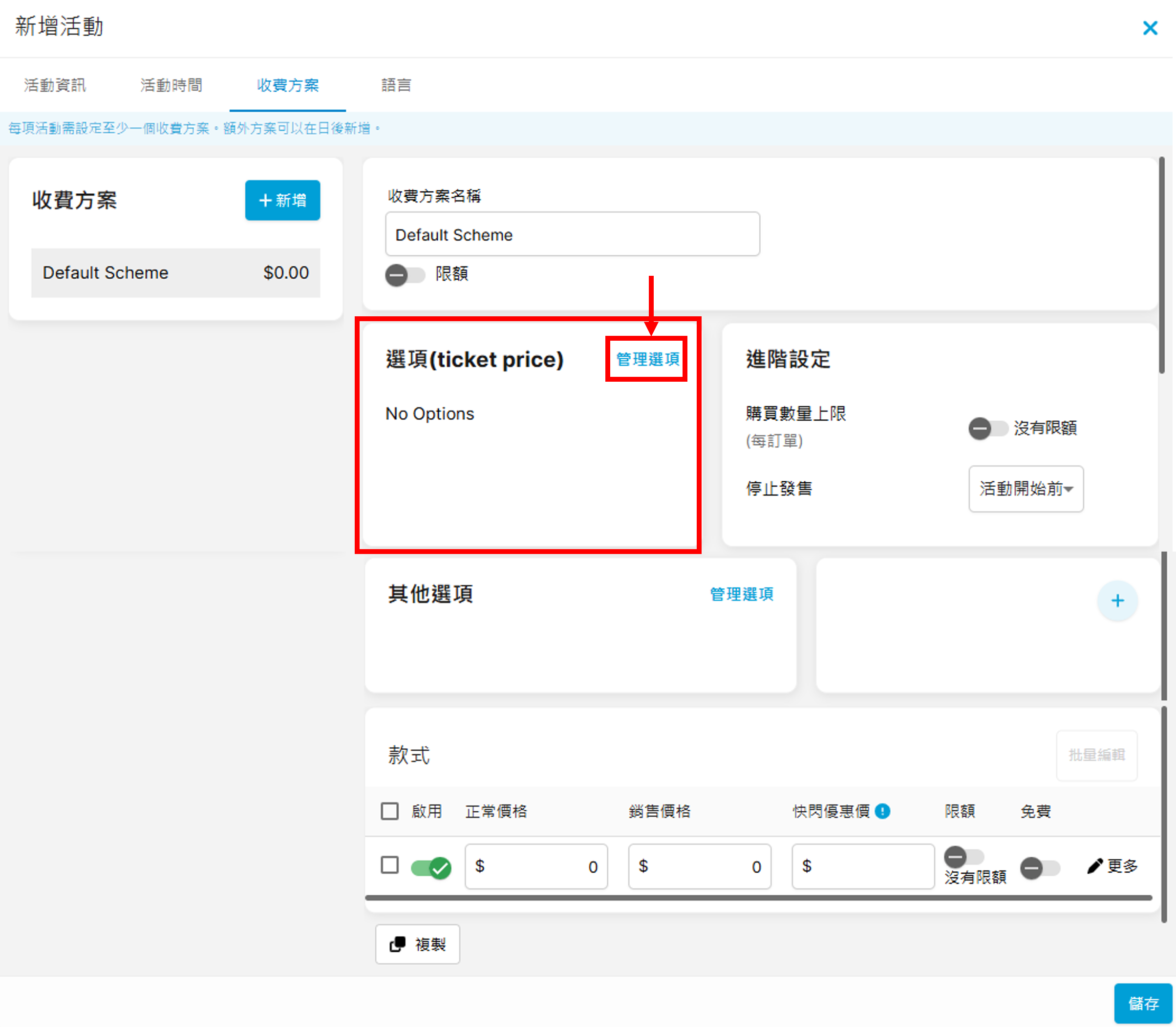 完成上方的「活動資訊」及「活動時間」後,可跳至「收費方案」分頁繼續進行設定: