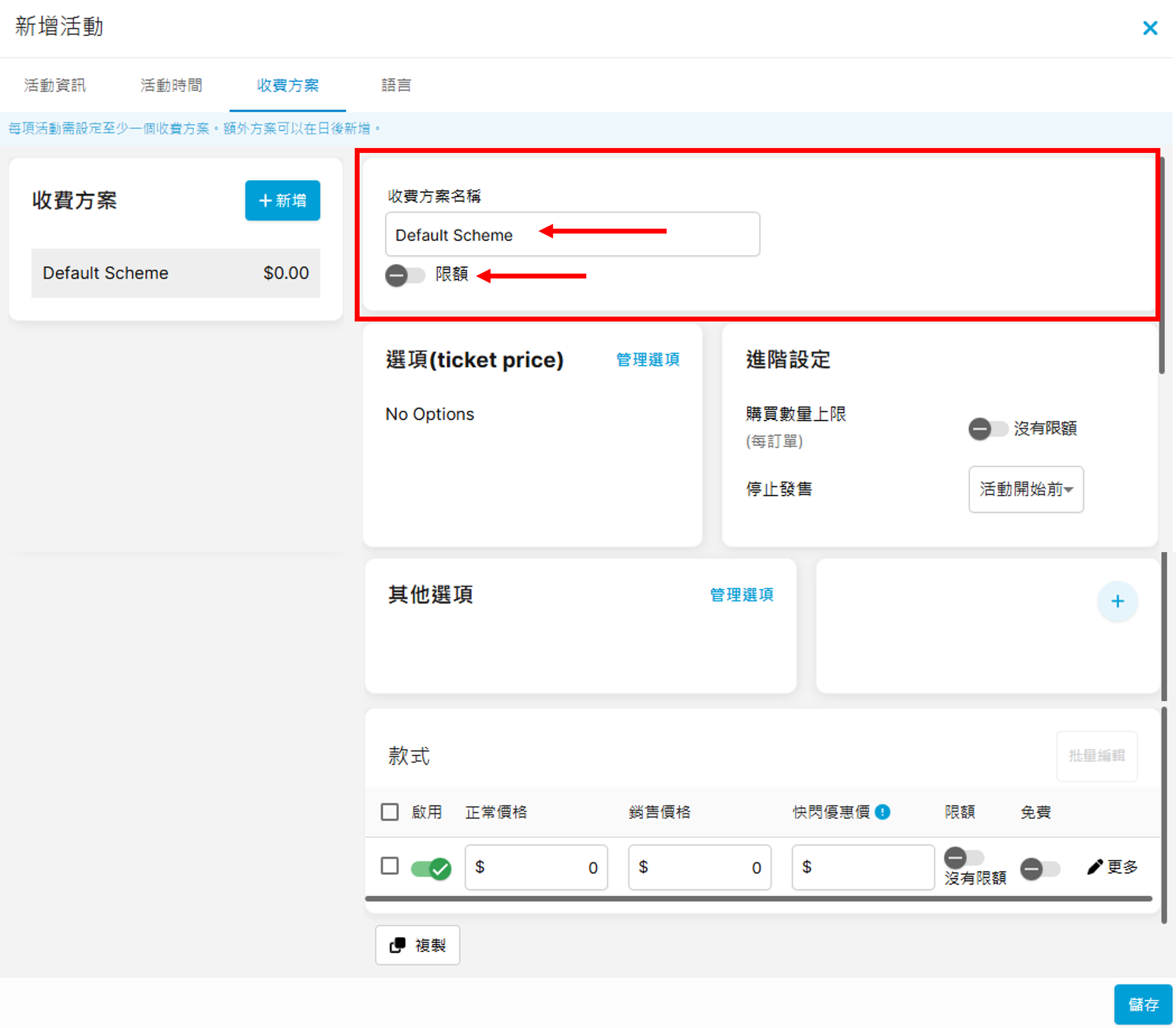 先為您的收費方案設定名稱,如該活動設限額,可開啟名稱下方的「限額」按鈕,並輸入限額的數量。