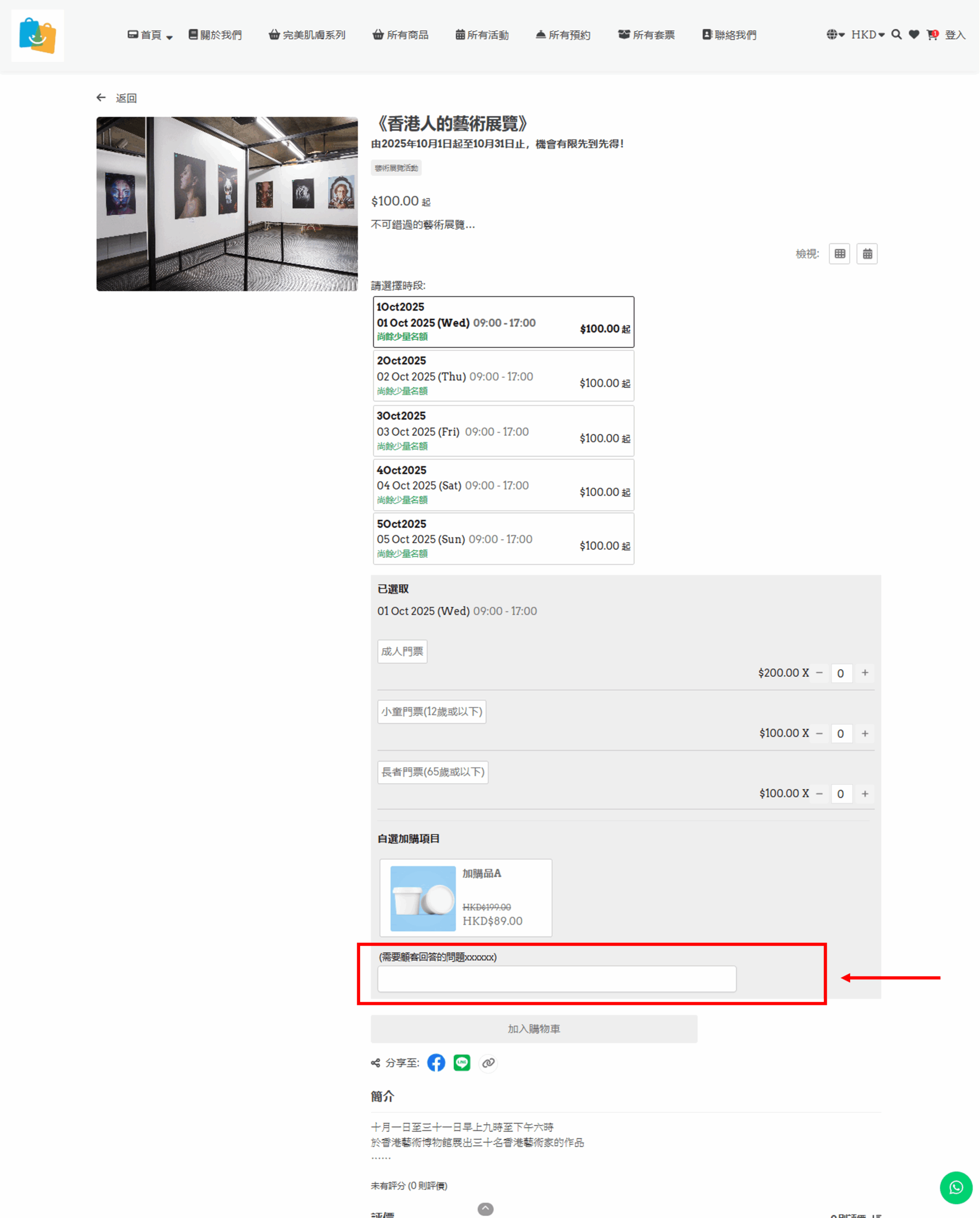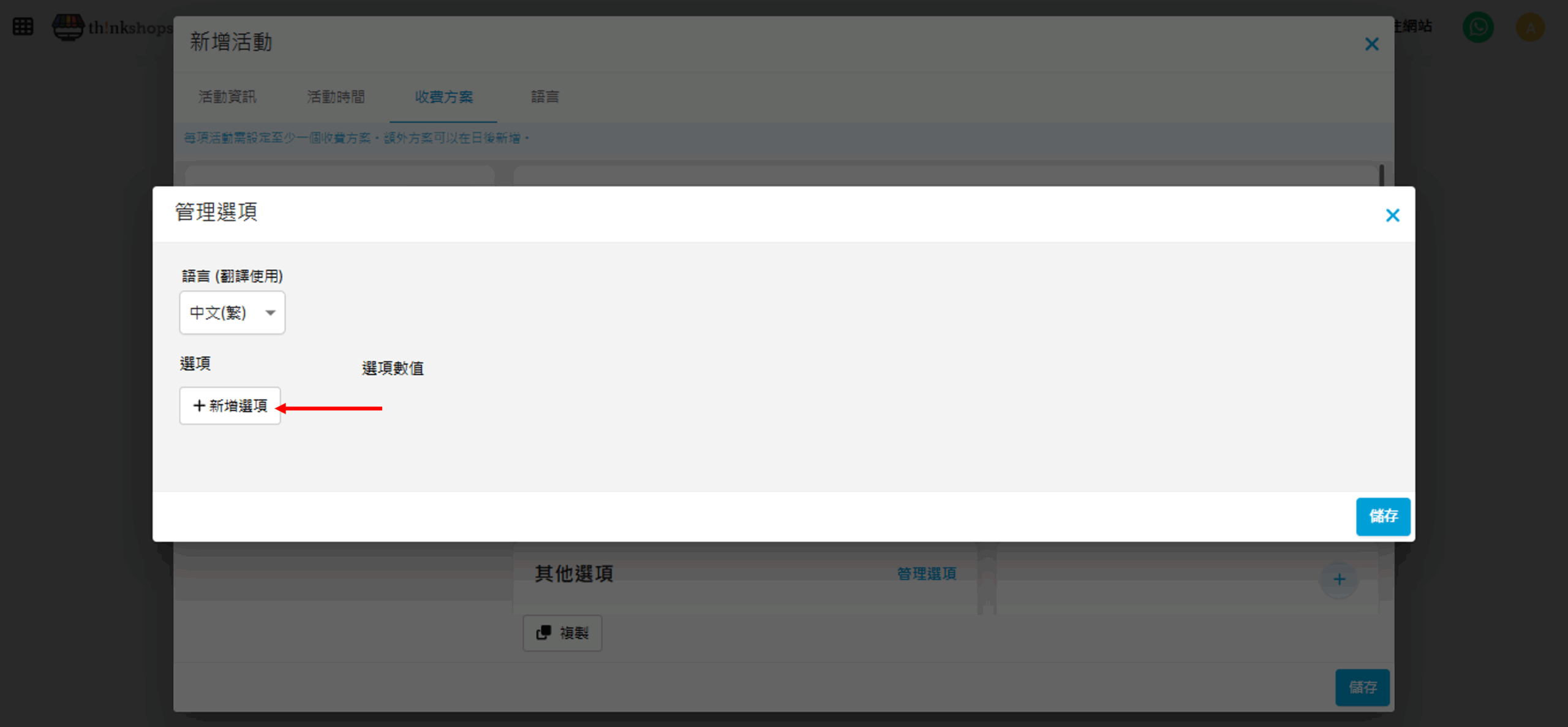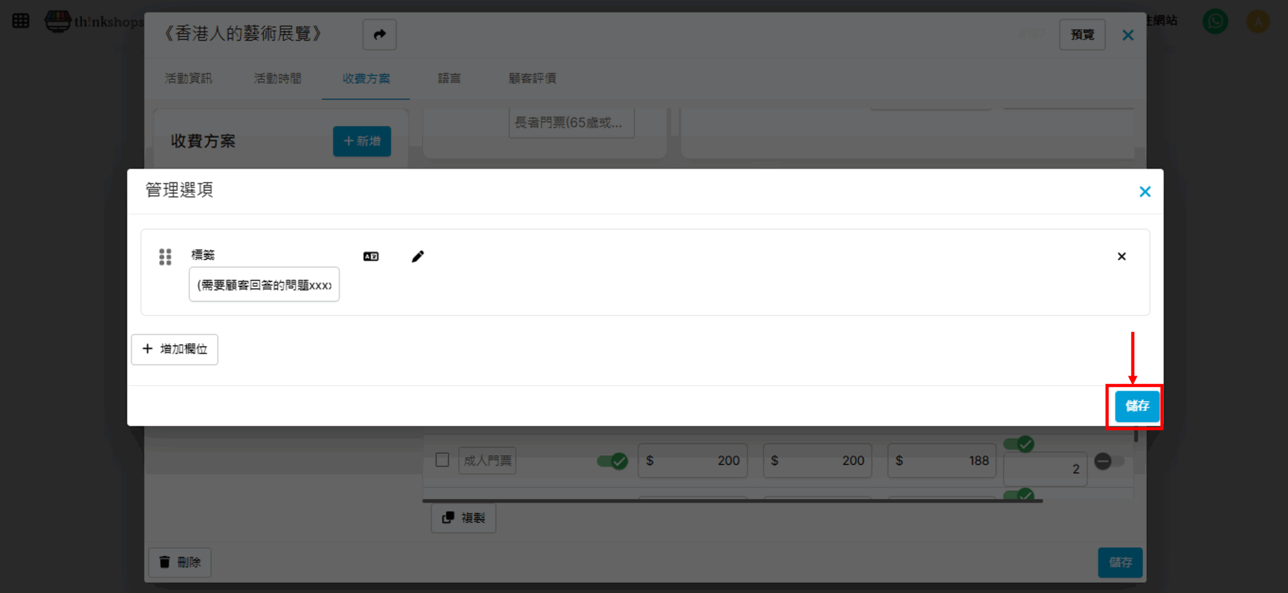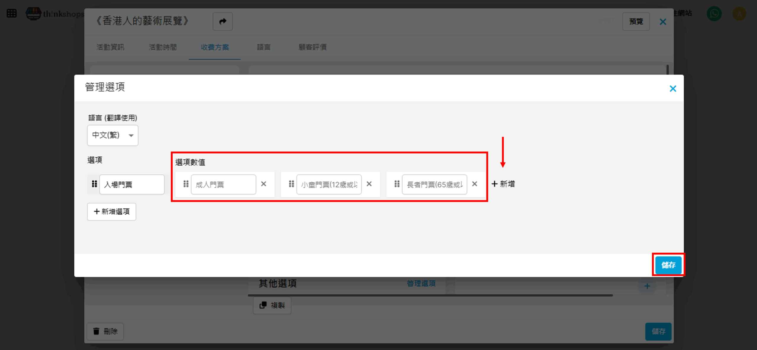 例:如活動門票是按年齡組別收費,您可於「選項數值」輸入「成人門票」、「小童門票」及「長者門票」(可按「+新增」加入更多選項)。完成後按「儲存」。