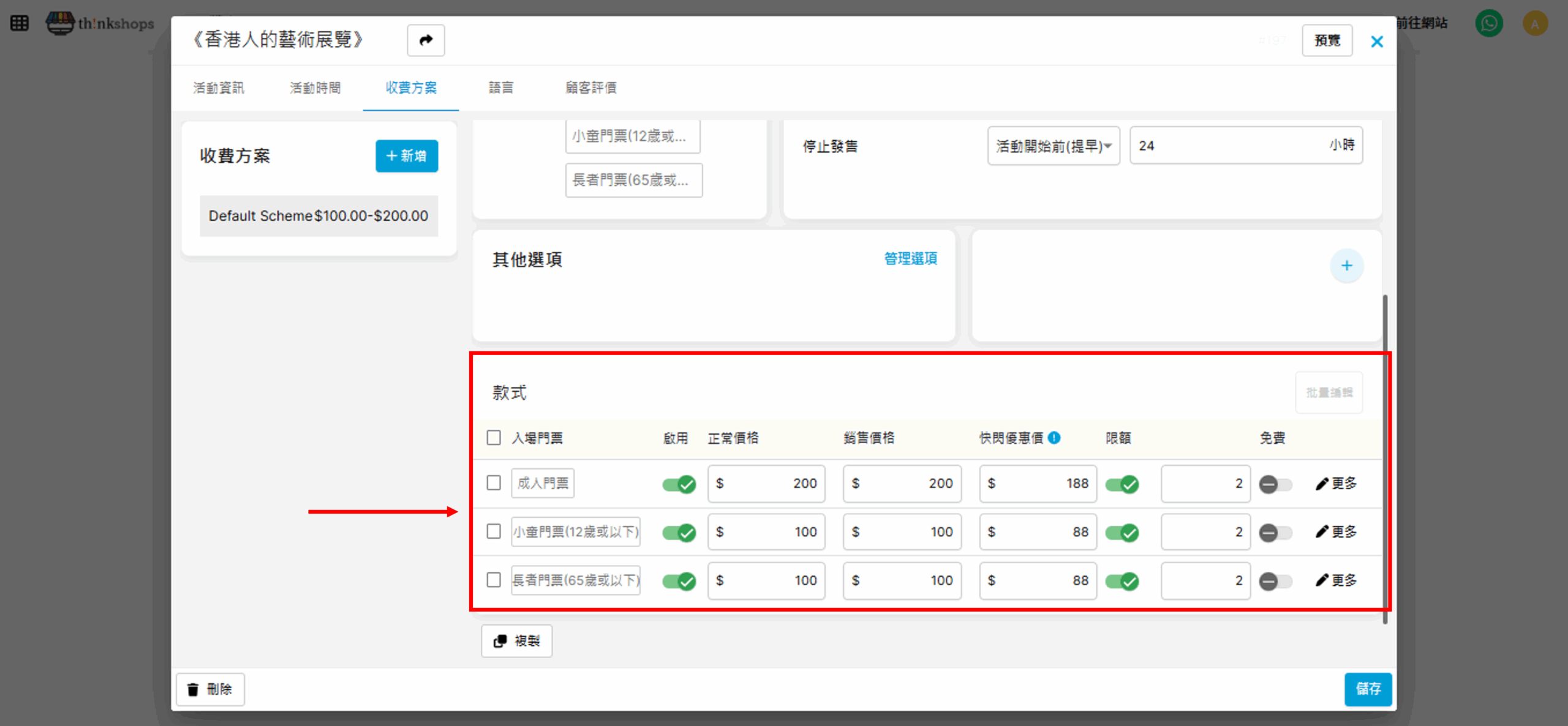 儲存後您會回到「收費方案」的畫面,剛才輸入的方案已新增到列表的最底部,您可輸入各選項的正常價格、銷售價格、快閃優惠價(如有)、限額(每次訂單可買上限數量)及免費。(請先點選「啟用」)