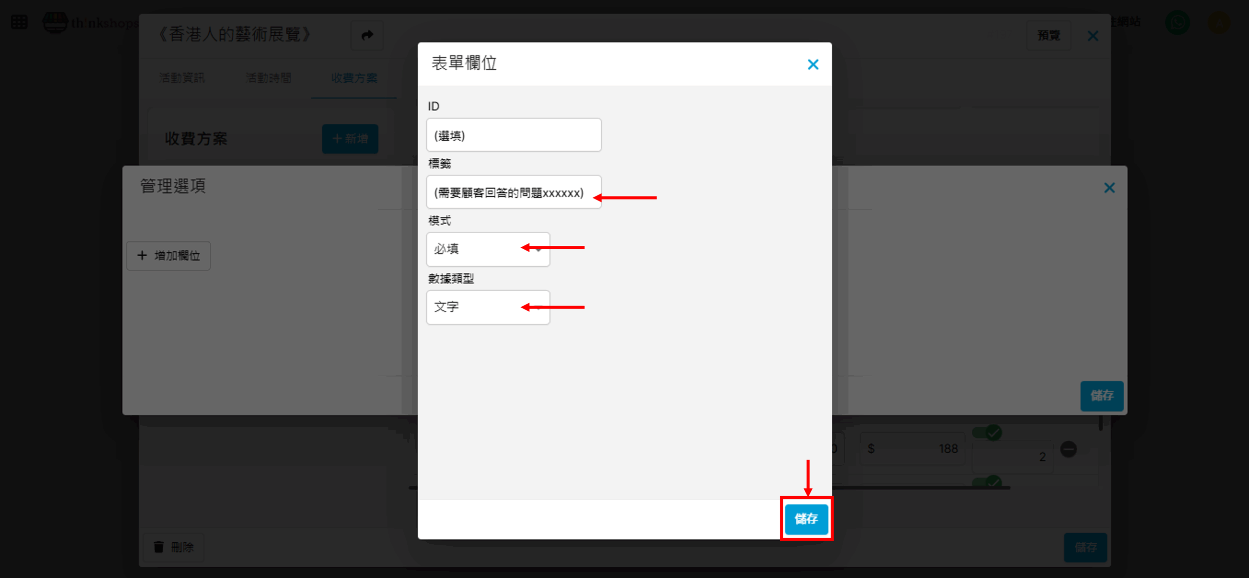 選擇欄位類別後,輸入表單的ID(選填)、標籤(即顧客會看到的問題)、模式(必填或選填)及數據類型,完成後按「儲存」。