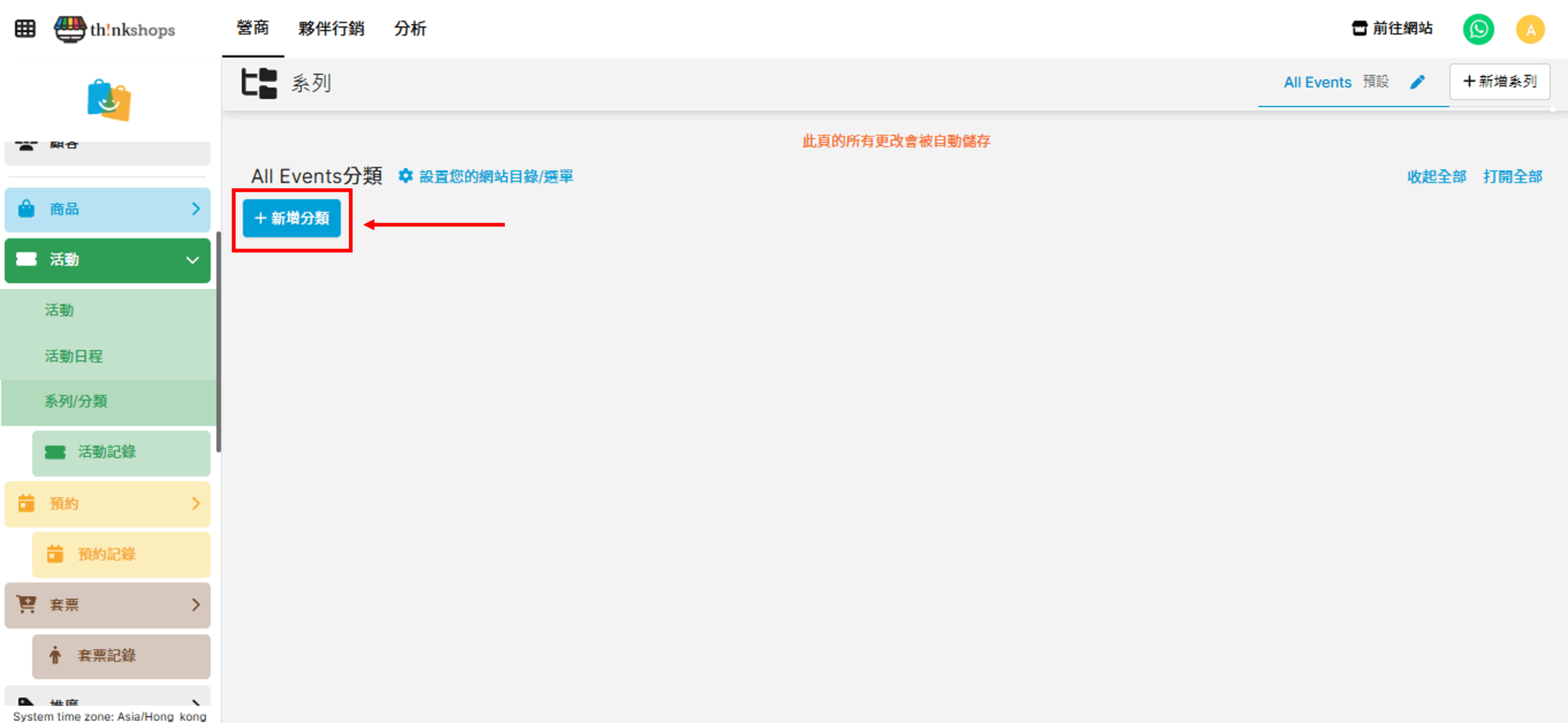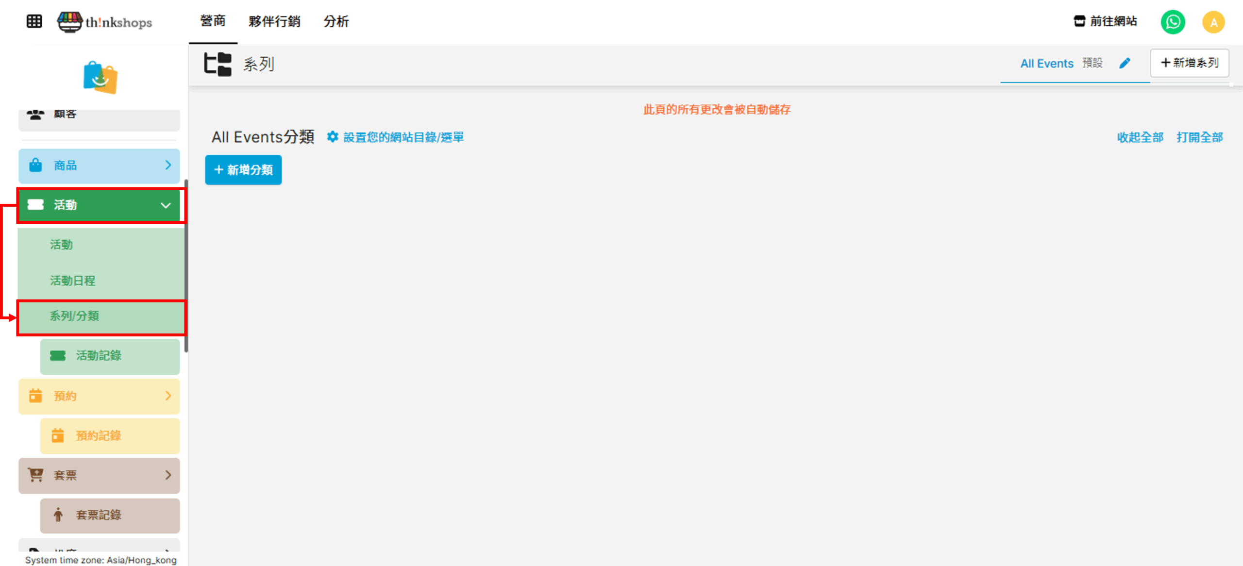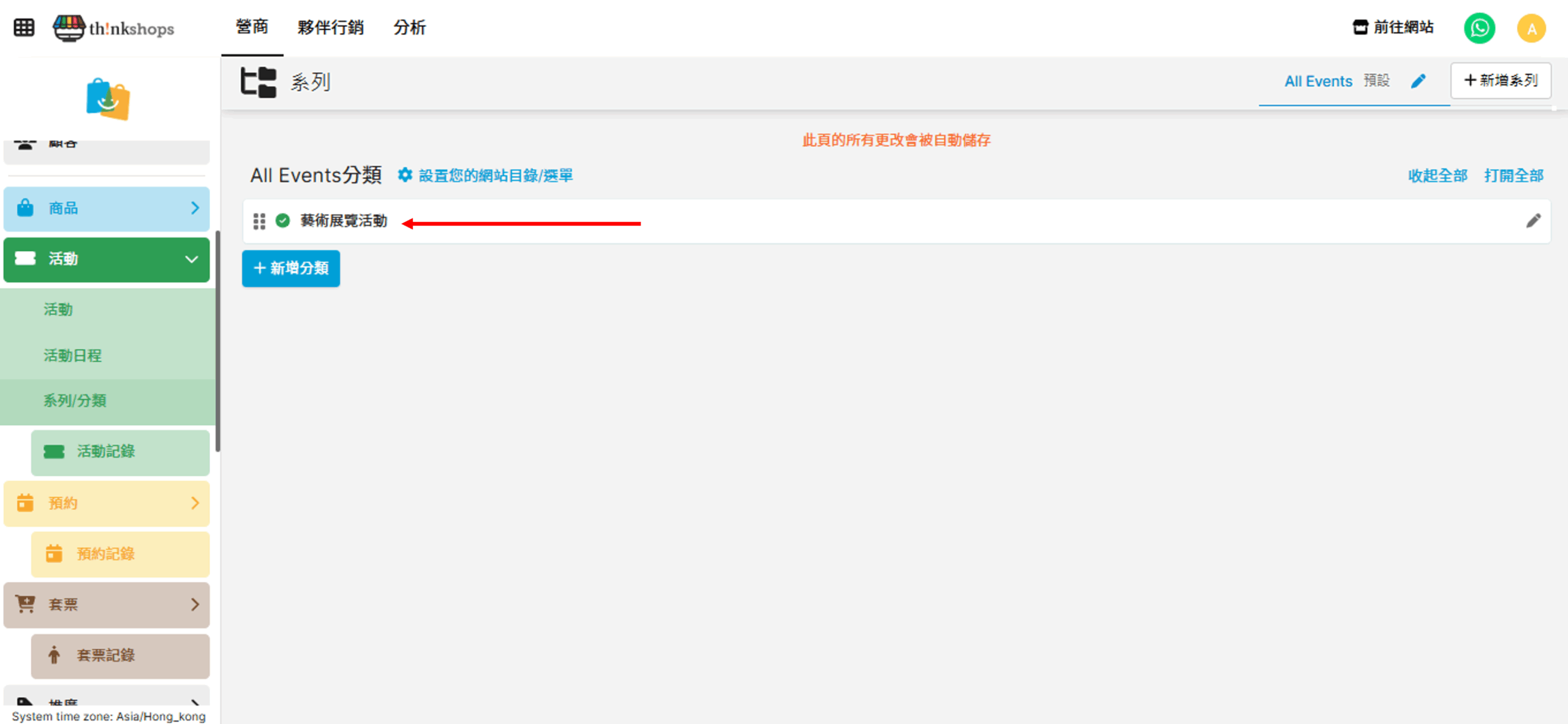 活動管理系列/分類活動管理 系列/分類 您可為設定活動門票的系列或分類,方便管理銷售。 設定方法 於後台左方點擊「活動」下的「系列/分類」: 按「+新增分類」: 您會進入到以下頁面: 一、輸入分類資訊 先啟用分類,輸入編碼(選填)、分類名稱及描述(選填)。 其次可選擇加入分類的橫額(會顯示於網站)及標籤: 二、輸入語言 如您的網站設定了多種語言,您可於「語言」分頁輸入各語言的文字,設定網站語言的方法可參考「系統設定> 語言設定」。 按右下方「儲存」後,分類便會新增到頁面: 以下是分類頁面的預覽效果: