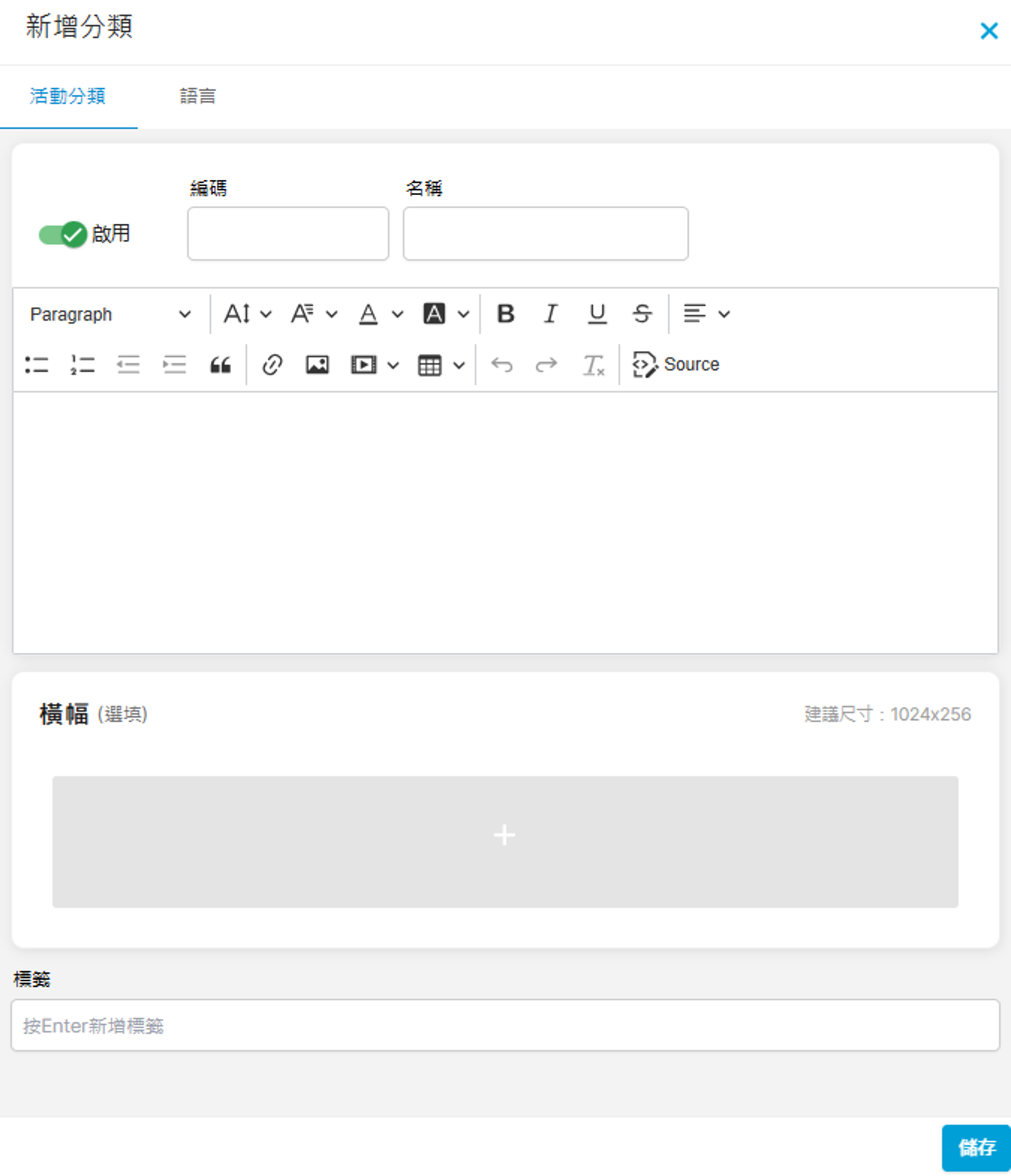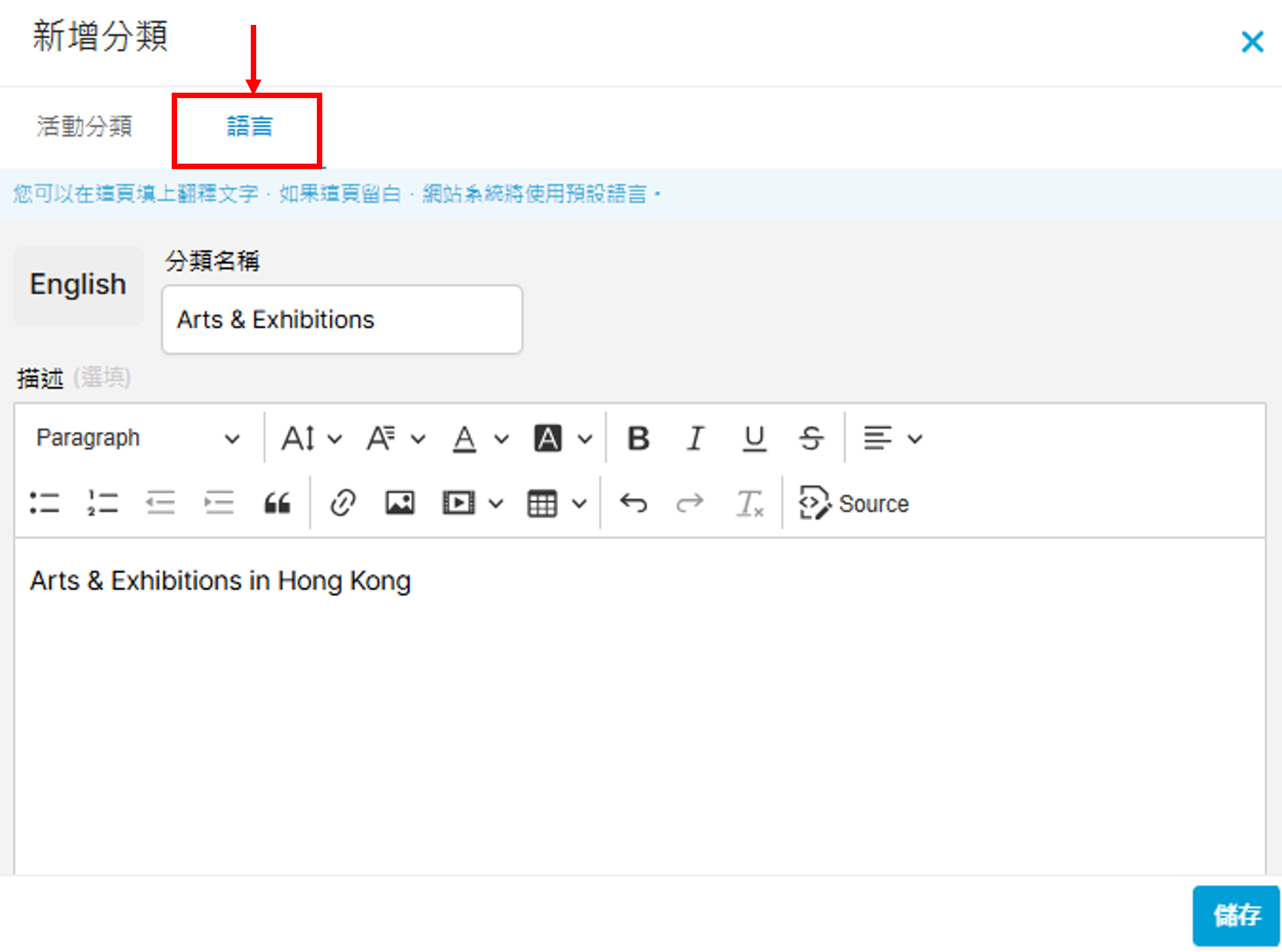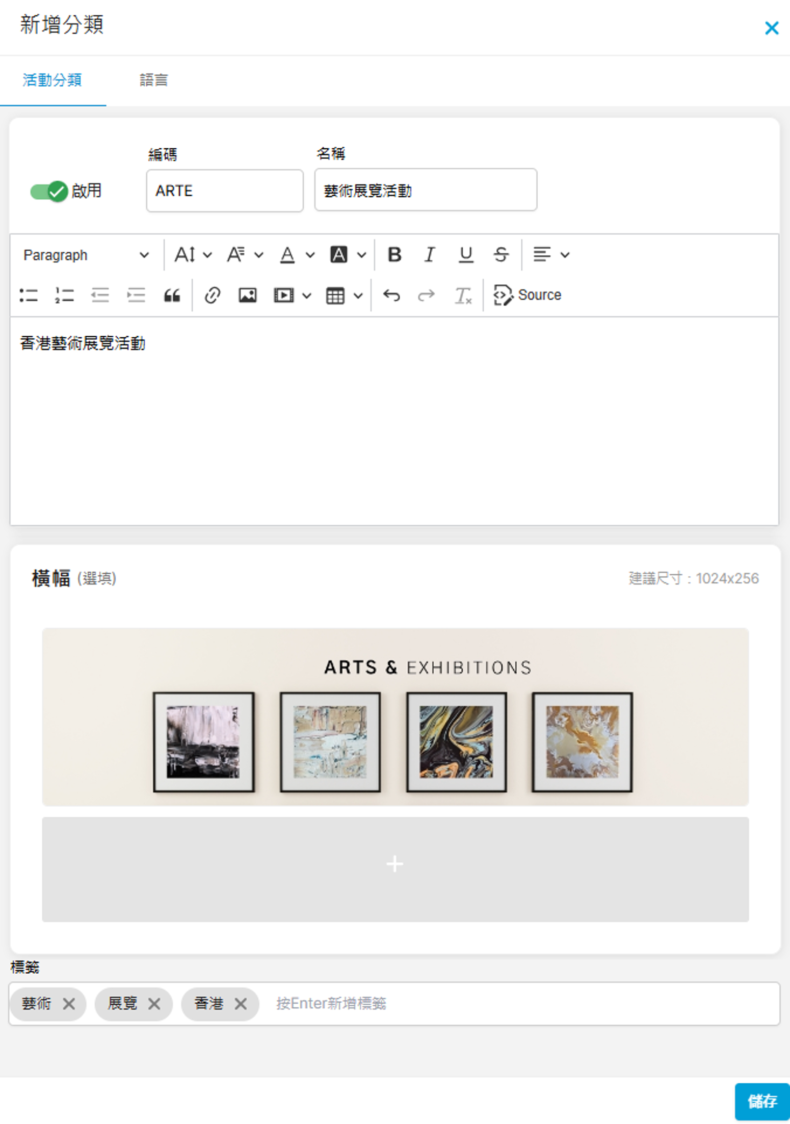 活動管理系列/分類活動管理 系列/分類 您可為設定活動門票的系列或分類,方便管理銷售。 設定方法 於後台左方點擊「活動」下的「系列/分類」: 按「+新增分類」: 您會進入到以下頁面: 一、輸入分類資訊 先啟用分類,輸入編碼(選填)、分類名稱及描述(選填)。 其次可選擇加入分類的橫額(會顯示於網站)及標籤: 二、輸入語言 如您的網站設定了多種語言,您可於「語言」分頁輸入各語言的文字,設定網站語言的方法可參考「系統設定> 語言設定」。 按右下方「儲存」後,分類便會新增到頁面: 以下是分類頁面的預覽效果: