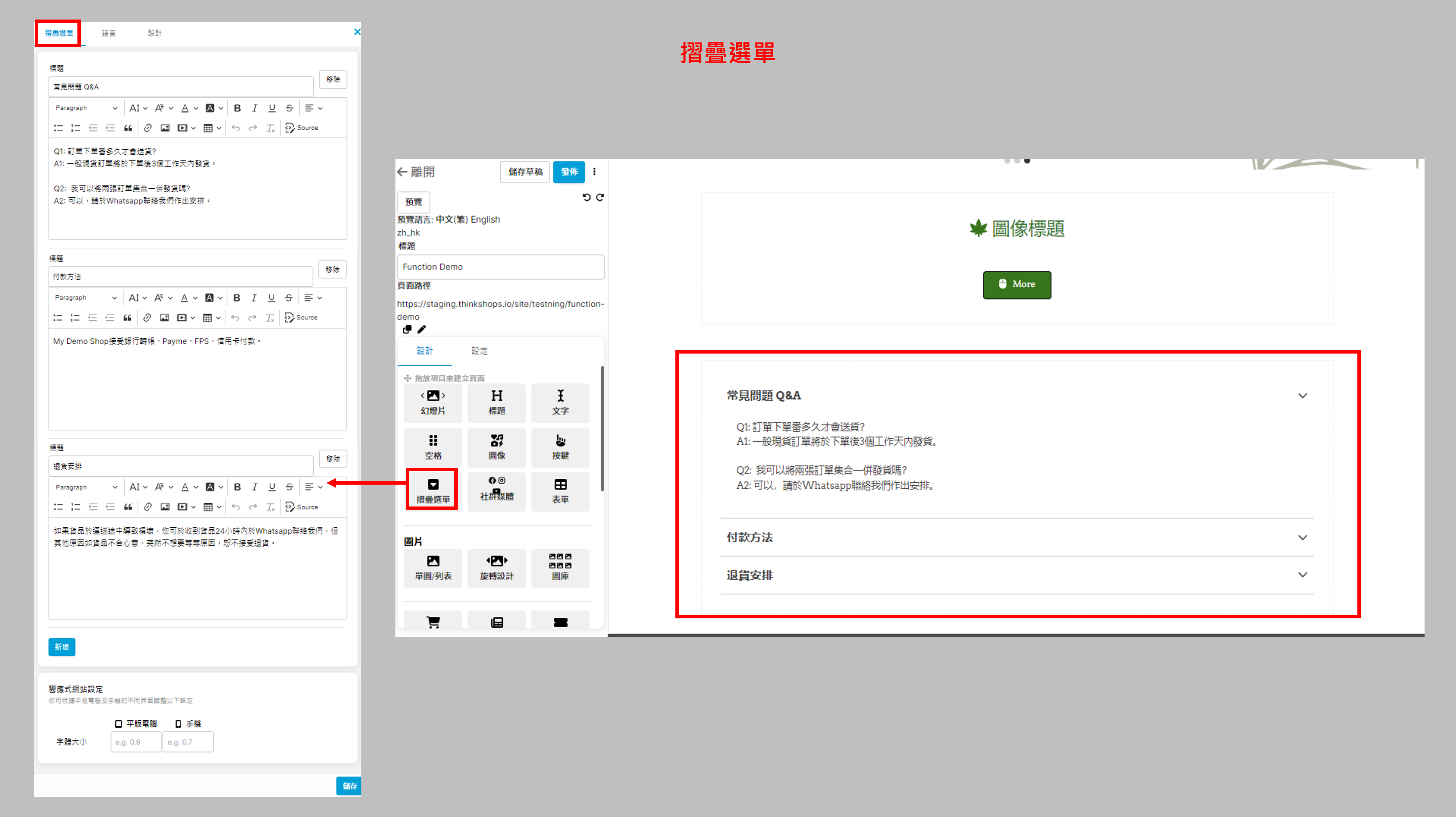 您可於頁面加入摺疊選單,例如常見問題Q&A,方便顧客查詢一般資訊。