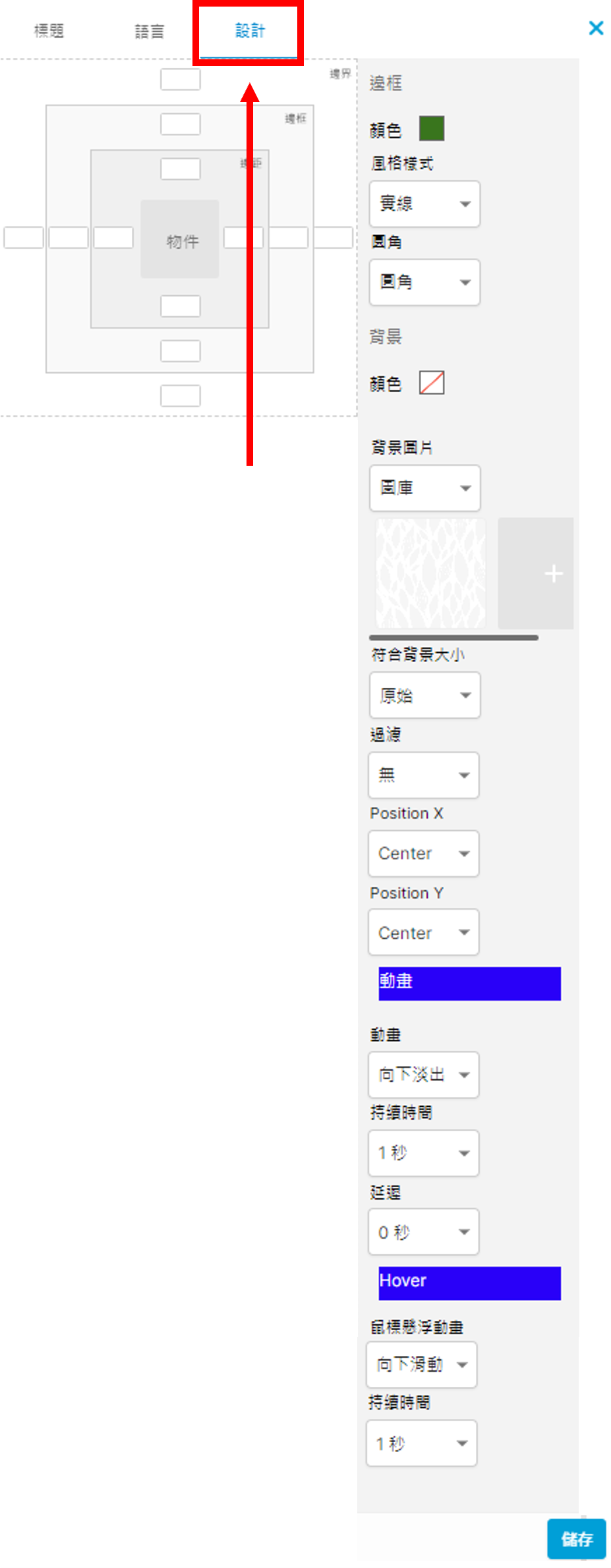 邊框 顏色:是否有邊框及邊框顏色,是否設為圓角 背景 是否加入背景顏色或背景圖片、背景大小、過濾(是否需要變暗) Position X 及 Position Y (只限圖片為背景):圖片貼左、置中或貼右 動畫 是否為區塊加入出現動畫,如是,選擇款式(您可透過預覽功能預覽動畫效果)、動畫的持續時間及延遲 鼠標懸浮動畫 鼠標懸浮於區塊上時是否加入動畫,如是,選擇款式(您可透過預覽功能預覽動畫效果)及持續時間 完成後按「儲存」。 其他設計元素的「設計」分頁與這裡的設定相同。
