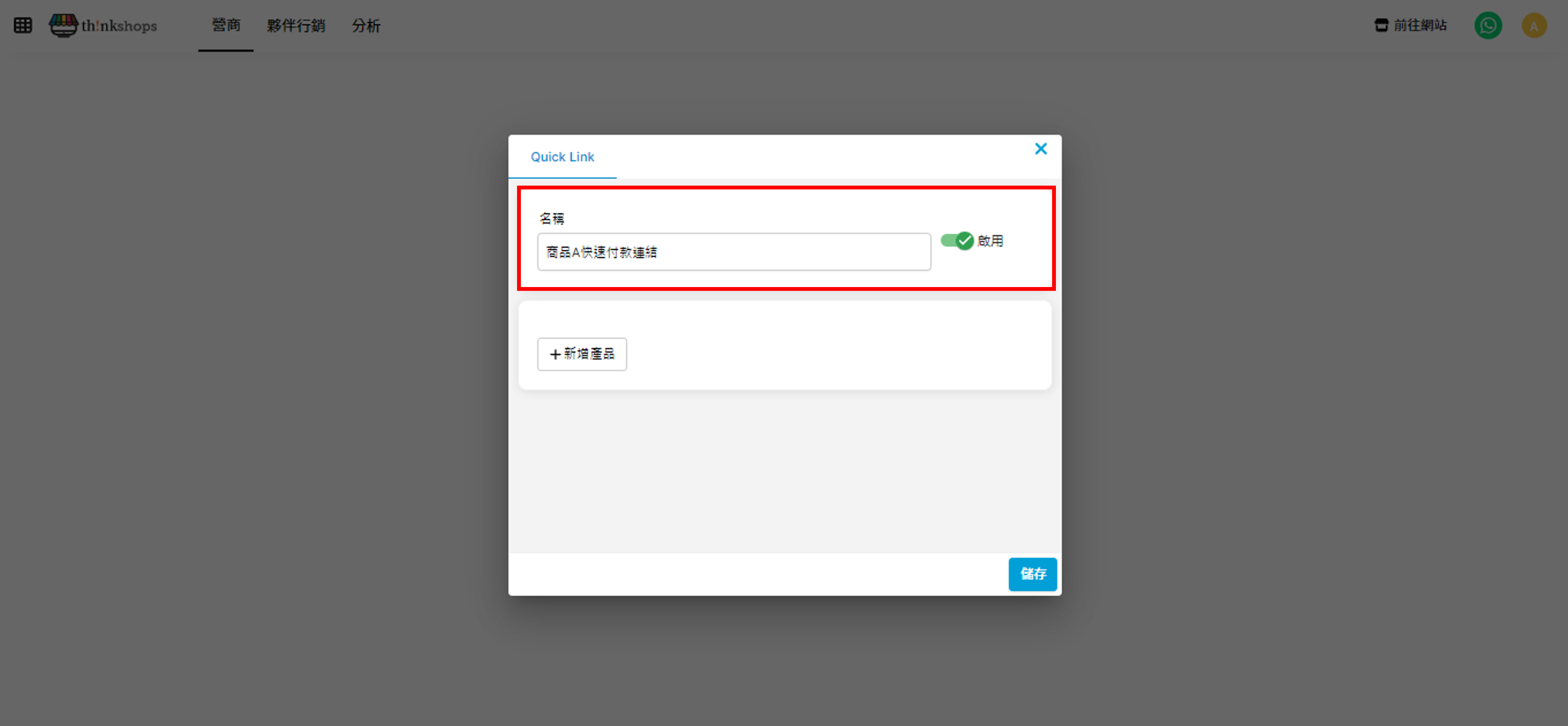 輸入快速付款連結的名稱(顧客不會看到此名稱),例如商品A快速付款連結。然後點選右方為「啟用」。
