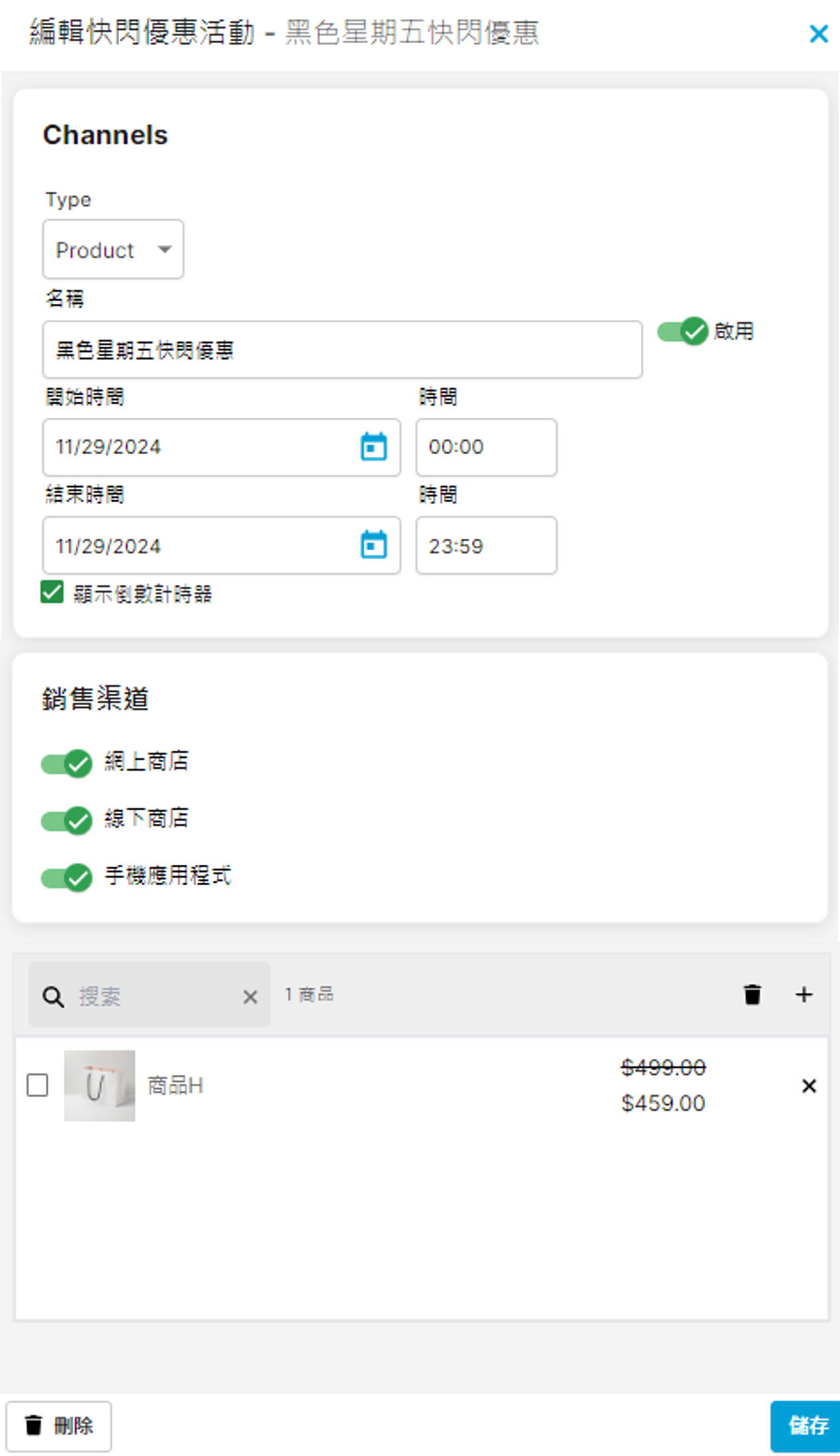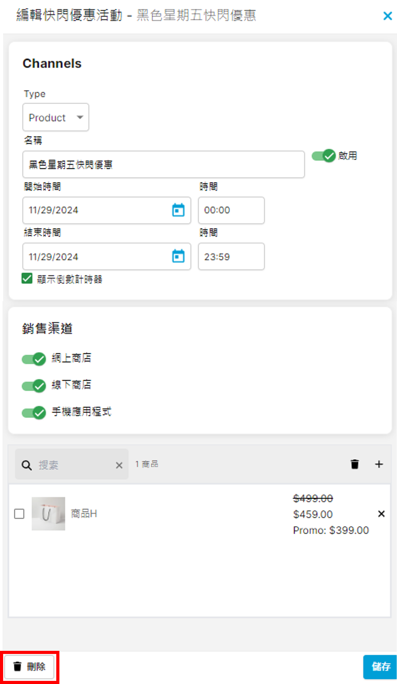 按照以上「編輯快閃優惠」步驟,點擊左下方的 「刪除」即可刪除該快閃優惠。