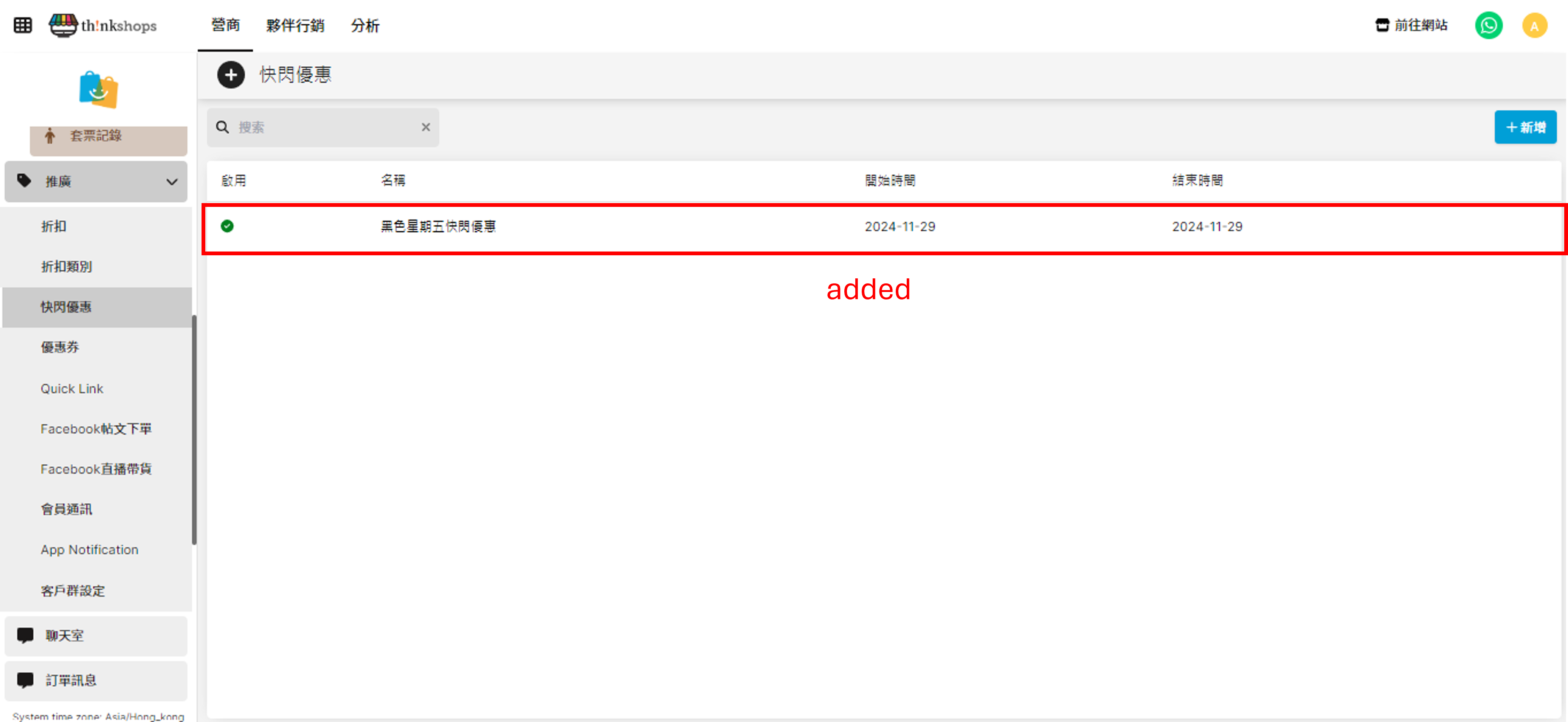 完成設定後,點擊右下方「儲存」按鈕,便會於快閃優惠欄新增剛儲存的快閃優惠。