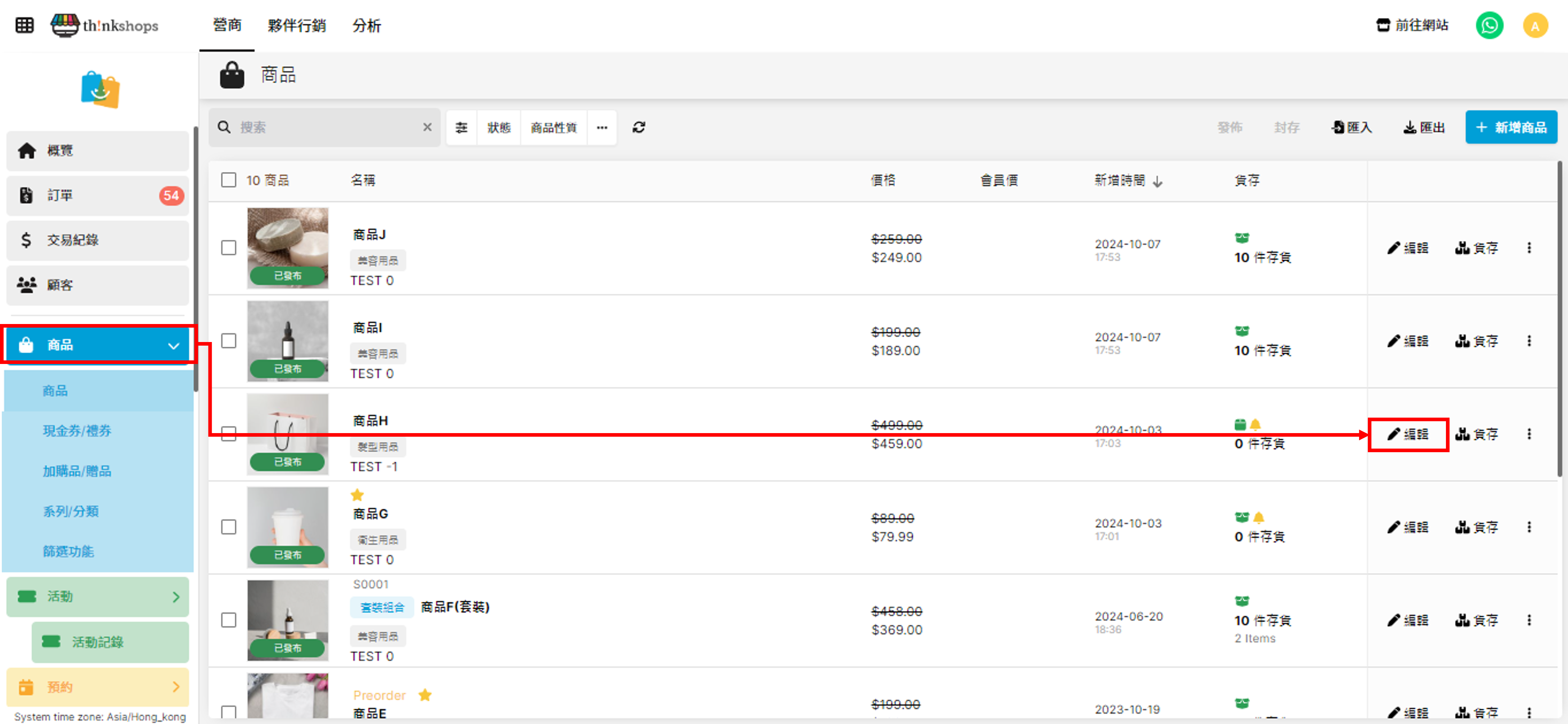 於左方主選單進入「商品」,點擊該快閃優惠的商品右方的「編輯」。