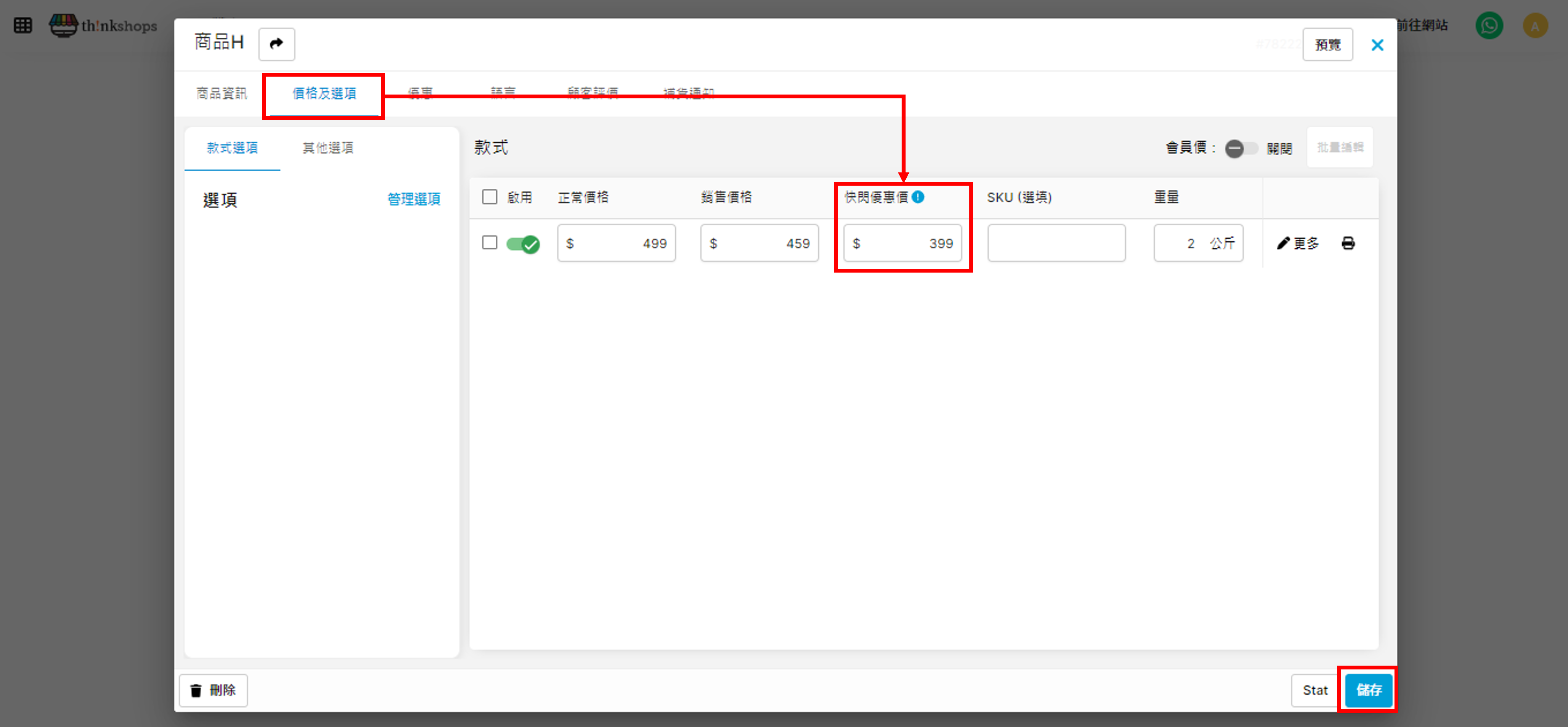 於「價格及選項」分頁中的「快閃優惠價」輸入快閃優惠期間的售賣金額,完成後按右下方「儲存」。