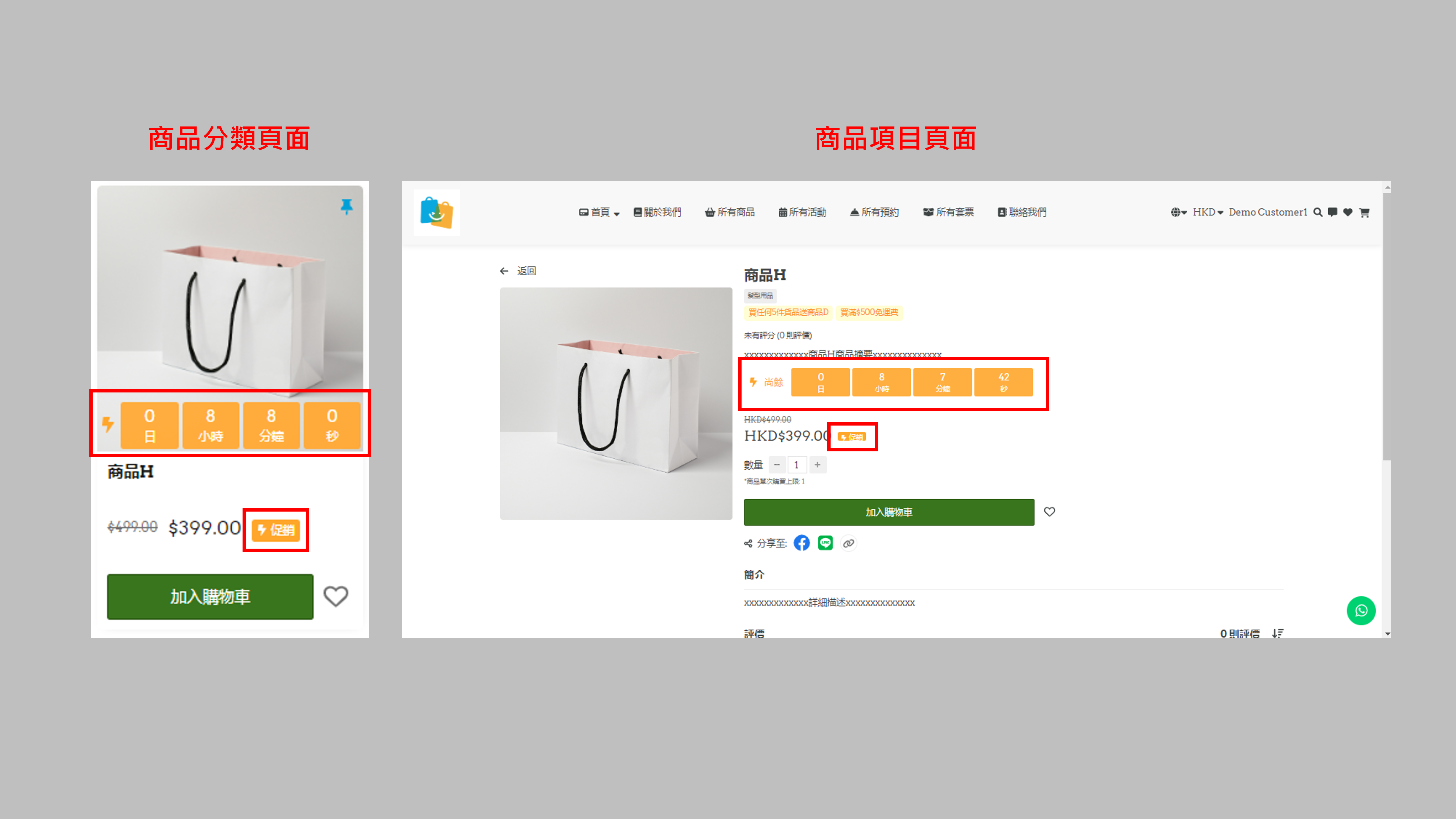 這樣便完成設定快閃優惠,於設定的時間期間,商品分類頁面及商品項目頁面中都會顯示倒數計時器及促銷圖案,告訴顧客快閃優惠的剩餘時間。