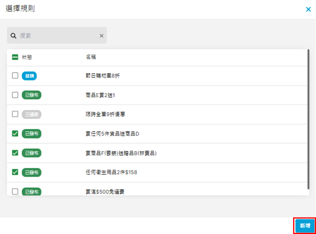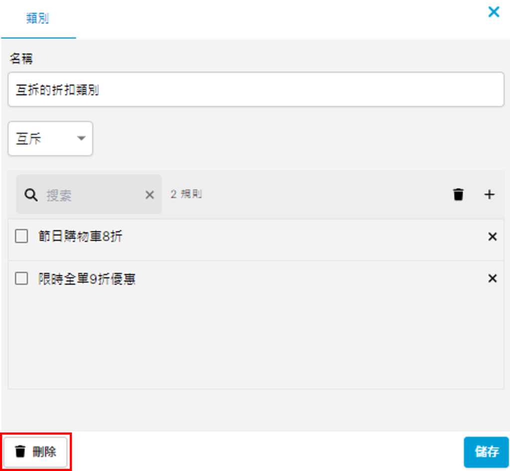 - 點按右邊藍色「+」按鈕,新增相應的折扣規則到此類別